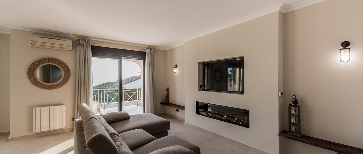 On entry level, you find a large living room with electric fireplace and TV wall. There are 5 double bedrooms of which 2 are en-suite. 3 bedrooms have balconies and with sea views or garden/pool view. All bedrooms have fitted wardrobes. The other 2 bedrooms share 1 bathroom/cloak room.
