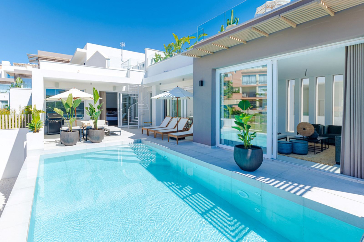 High ceilings and large heat-resistant windows make the properties feel very spacious and bright allowing for the seamless integration of indoor and outdoor living spaces. Along with the two 8 x 4 metre heated saltwater swimming pools (with counter-current and electric cover) are a generous 89 m2 of terrace/porch areas and 2 huge roof solariums of 76 m2 and 141 m2 with glass balustrade and impressive 360 degree views over the sea and coastline. The total plot size is 977 m2.