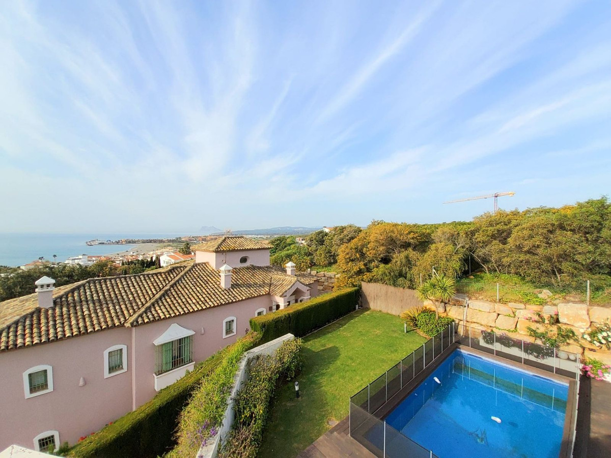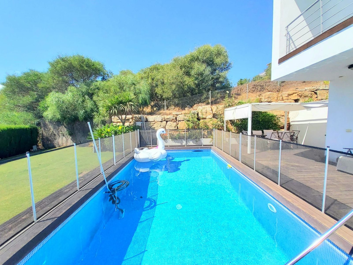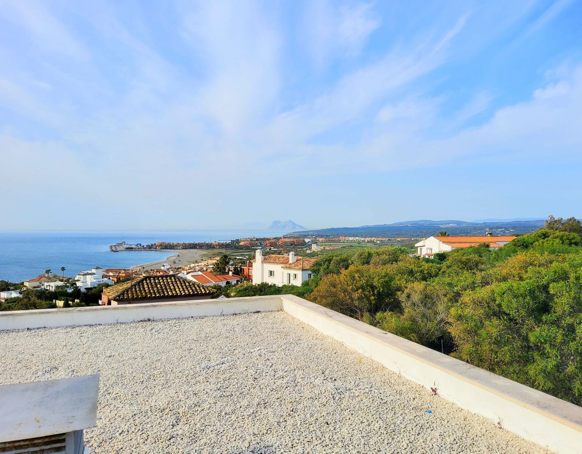 WONDERFUL CONTEMPORARY STYLE VILLA WITH GARDEN, PRIVATE POOL AND BEAUTIFUL VIEWS OF THE SEA, GIBRALTAR AND AFRICA. With a privileged location in a luxurious residential area in Torreguadiaro, JUST 5 MIN WALK FROM THE BEACH and the promenade, which will take you to the famous Port of Sotogrande, where you will find a large selection of bars, restaurants and leisure areas. Prestigious polo fields such as Ayala or golf courses such as Valderrama are 4 km away, Gibraltar airport is 10 km away and Marbella is 30 km away. This beautiful property is distributed over three floors, built with top quality materials and excellent finishes. Enjoy great light thanks to its large windows throughout the house and its SOUTH ORIENTATION. On the first floor we find the spacious living-dining room with an integrated kitchen, all in an open-plan style, very comfortable and uncluttered. On the upper floor, the rooms, of which the magnificent master bedroom with an ivory-tone marble jacuzzi bathroom. All rooms are equipped with custom wardrobes made of white lacquered wood, a minimalist and orderly feeling that achieves the entire design of the Villa.