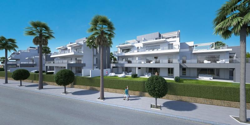 All apartments will have large terraces, a southerly orientation and the development will have attractive communal gardens and two swimming pools when it is complete. Specifications include fitted kitchen with oven, cooker, hob and integrated white goods, air conditioning and heat pump, wide floor to ceiling sliding terrace doors, built-in wardrobes in the bedrooms and all properties will be built to the latest European technical code.