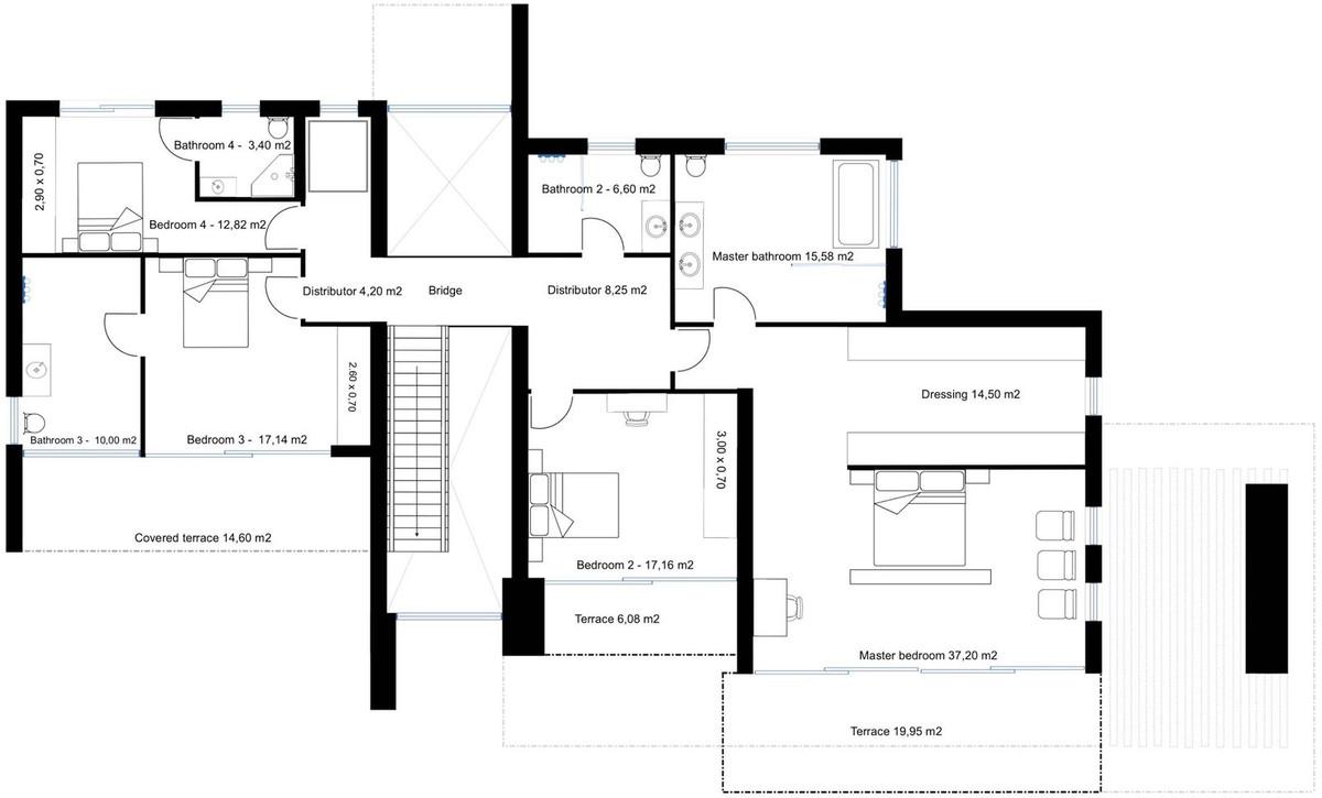 First floor: The staircase or elevator leads you to a landing that divides the first floor into 2 parts. On one side you have 2 bedrooms each with an en-suite bathroom and one of the bedrooms has a private terrace. On the other side, you have a bedroom with a bathroom and a private terrace. And of course, on this floor, you have the master bedroom with a huge dressing, en-suite bathroom, and a big terrace.