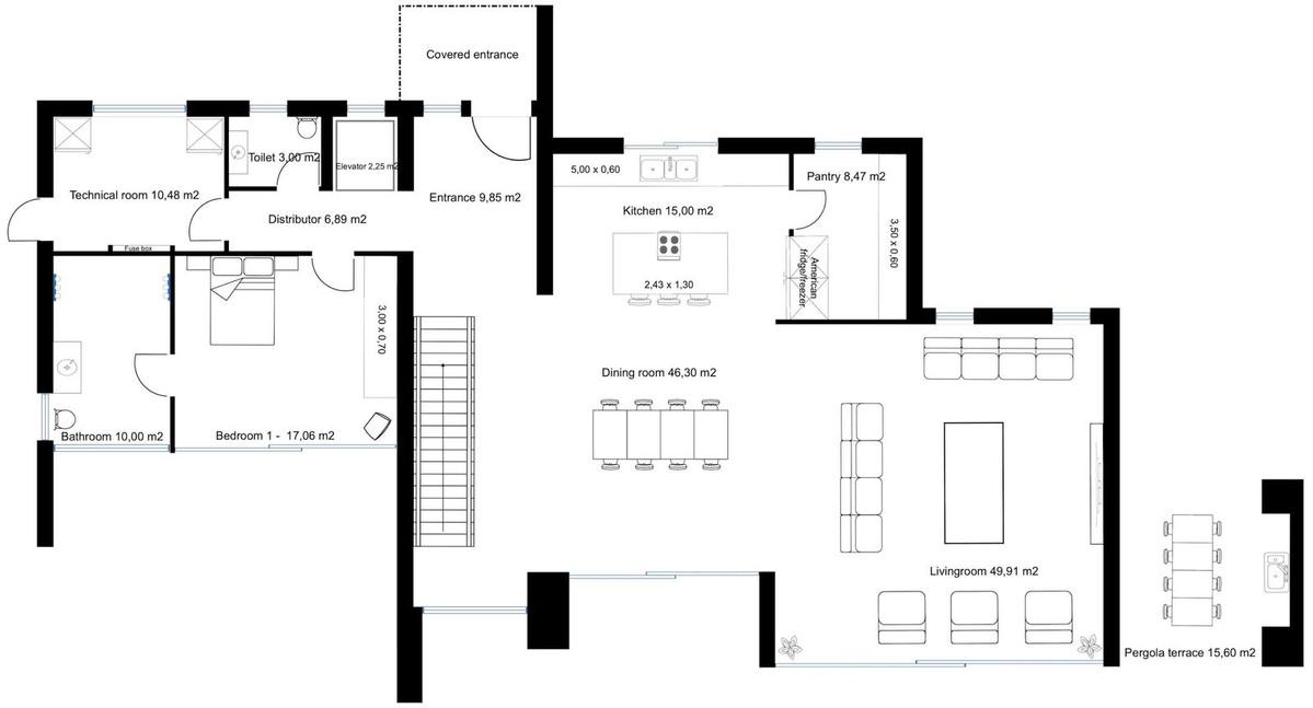 Ground floor: Pergola carport port with motorized entrance gate, entrance hall with double height ceiling, elevator, a distributor which leads to the guest toilet, technical room, and a bedroom with a big en-suite bathroom and private terrace. Furthermore, on this floor, you have a huge dining room with a tailor-made open-plan kitchen fully equipped with Bosch appliances, a pantry and a big living room. Both, the dining room and living room give out to the huge, covered terraces, and for those who love swimming or splashing a huge 80 m2 pool with a kid’s pool, water-featured bronzing area, and a chill-out. There is pavement around the full villa to make access to the different parts of the garden and villa easy. The garden will be easy to maintain and fully fenced with a 2-meter-high galvanized strong fence.