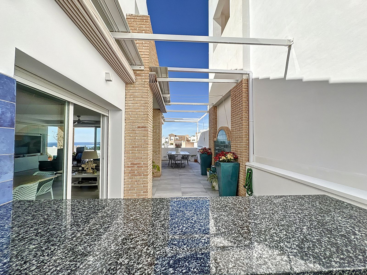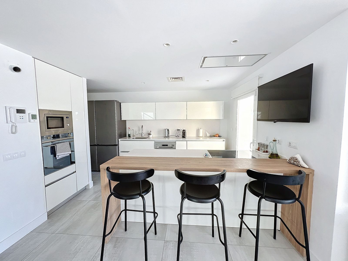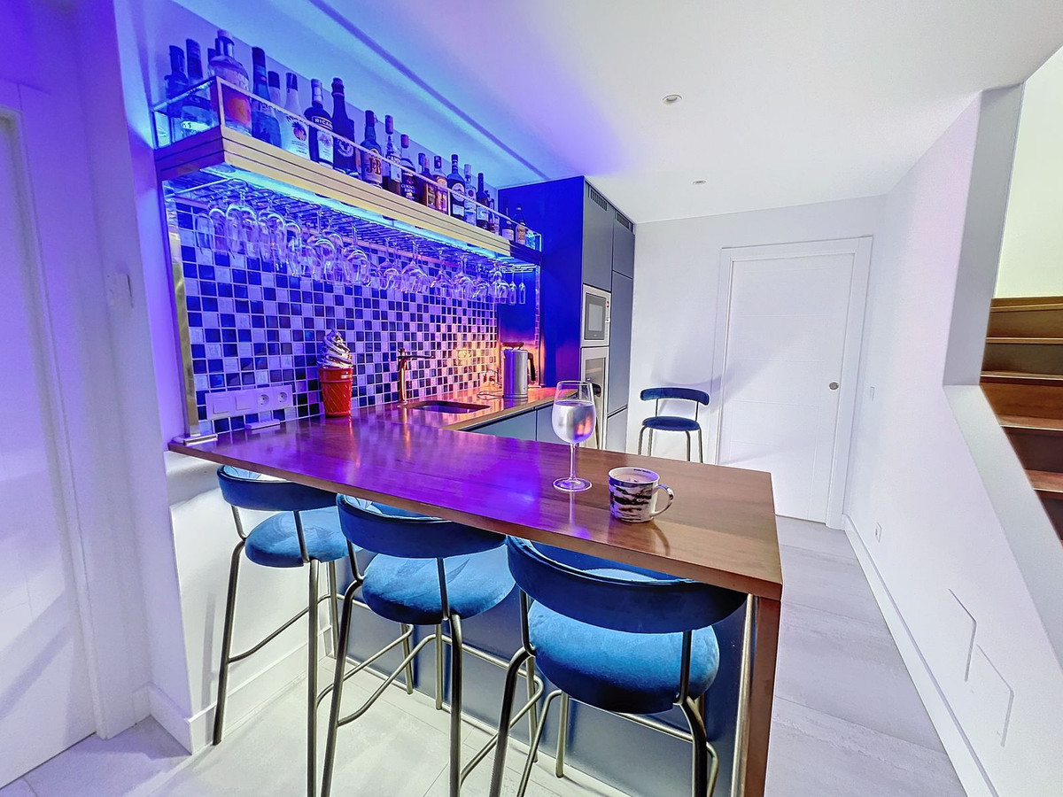 Nestled in the prestigious Big Blue Villas community in Benalmádena, this beautifully renovated villa defines modern coastal living. Spanning three levels, the home offers 3 spacious bedrooms, 3 sleek bathrooms, plus an additional guest toilet – ensuring abundant space and privacy for all. On the ground floor, you’ll be greeted by a stylish open-plan living area, featuring a stunning LED-lit bar that sets the perfect ambiance for entertaining, alongside a projector TV for an immersive movie experience. Double doors open out to the terrace, extending your living space and seamlessly blending indoor and outdoor living. The master bedroom, located on this level, is a true retreat, offering a luxurious en-suite bathroom and a large walk-in dressing room. A guest bedroom with its own en-suite ensures comfort and privacy for visitors. On the first floor, you’ll find a chic lounge area that flows effortlessly into a modern, fully-equipped open-plan kitchen and dining space. A utility room adds to the convenience. The expansive terrace offers panoramic sea views, creating the ultimate backdrop for relaxation or hosting guests, complete with a built-in bar for alfresco entertaining. The top floor is home to another en-suite guest bedroom, featuring its own private terrace – the perfect spot for unwinding with breathtaking views.