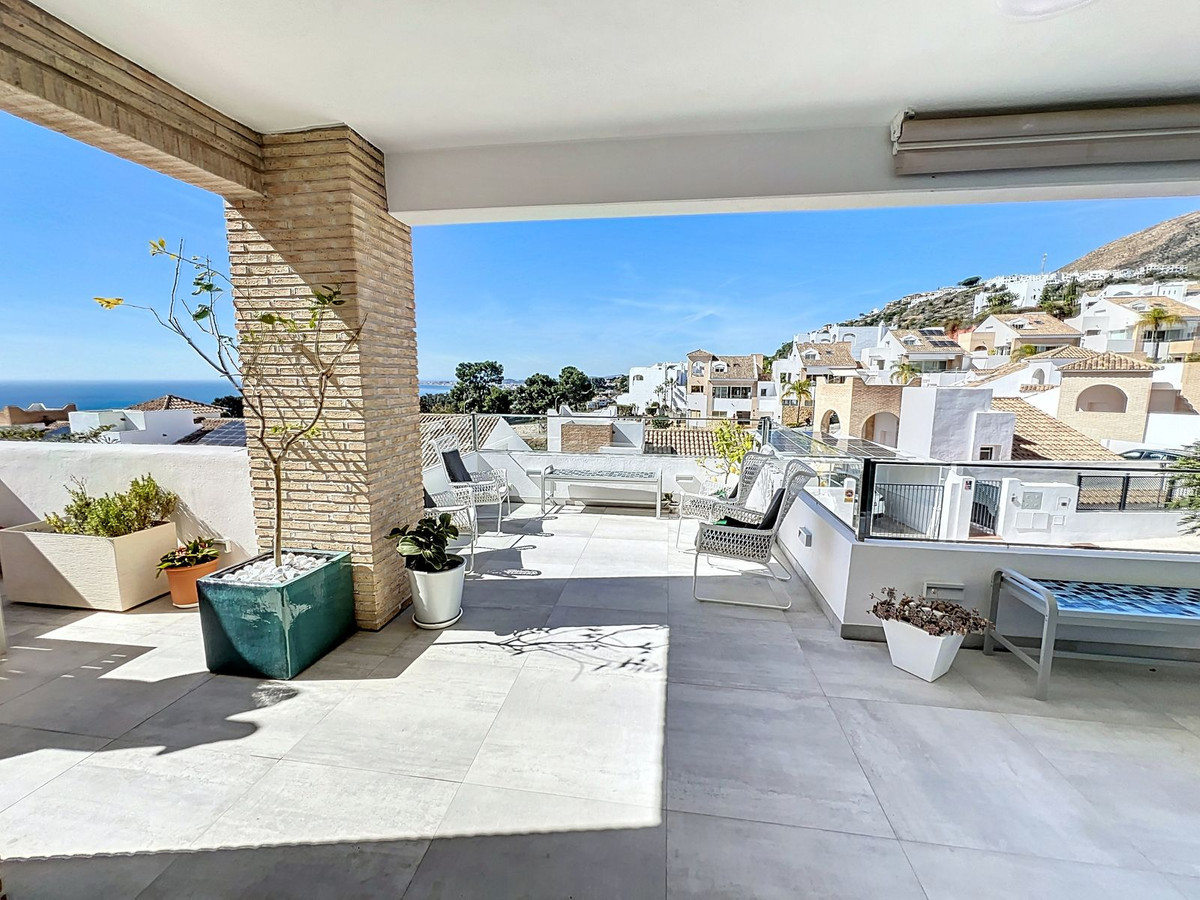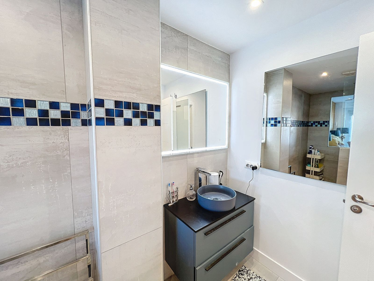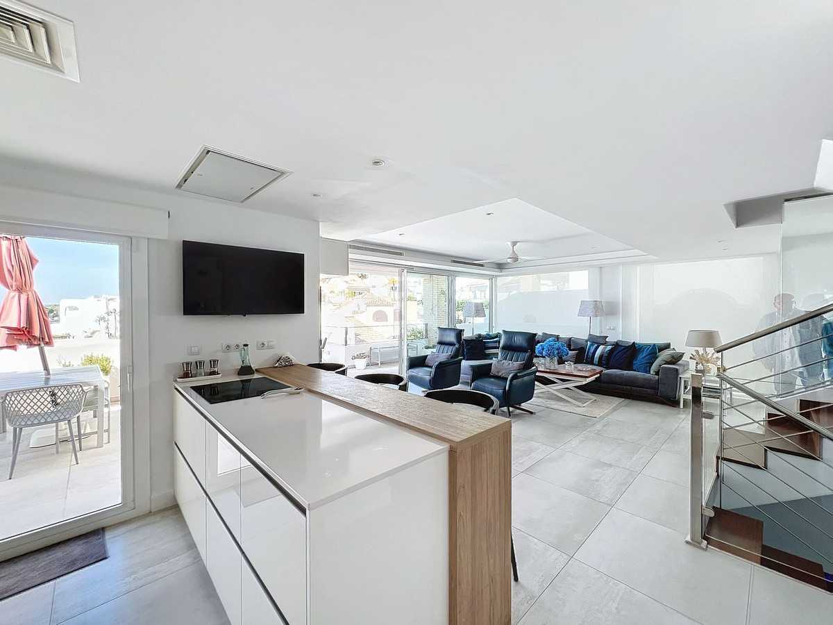 Nestled in the prestigious Big Blue Villas community in Benalmádena, this beautifully renovated villa defines modern coastal living. Spanning three levels, the home offers 3 spacious bedrooms, 3 sleek bathrooms, plus an additional guest toilet – ensuring abundant space and privacy for all. On the ground floor, you’ll be greeted by a stylish open-plan living area, featuring a stunning LED-lit bar that sets the perfect ambiance for entertaining, alongside a projector TV for an immersive movie experience. Double doors open out to the terrace, extending your living space and seamlessly blending indoor and outdoor living. The master bedroom, located on this level, is a true retreat, offering a luxurious en-suite bathroom and a large walk-in dressing room. A guest bedroom with its own en-suite ensures comfort and privacy for visitors. On the first floor, you’ll find a chic lounge area that flows effortlessly into a modern, fully-equipped open-plan kitchen and dining space. A utility room adds to the convenience. The expansive terrace offers panoramic sea views, creating the ultimate backdrop for relaxation or hosting guests, complete with a built-in bar for alfresco entertaining. The top floor is home to another en-suite guest bedroom, featuring its own private terrace – the perfect spot for unwinding with breathtaking views.