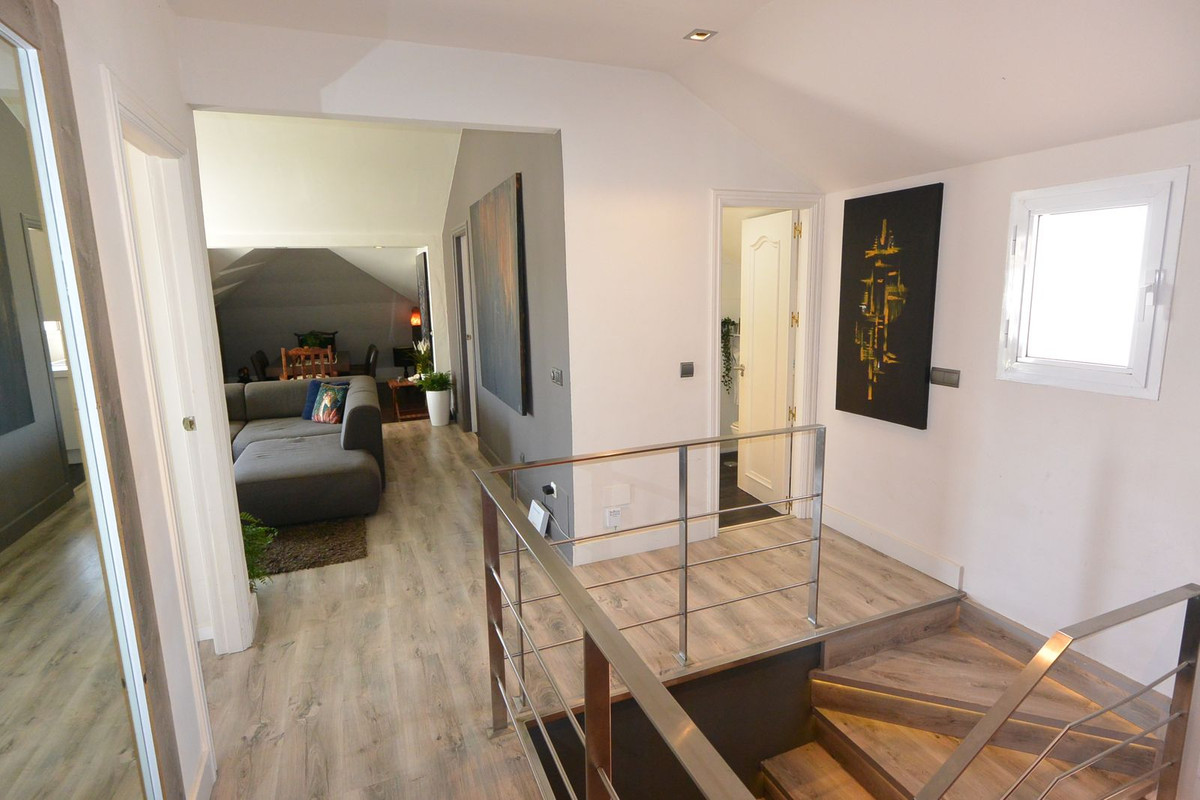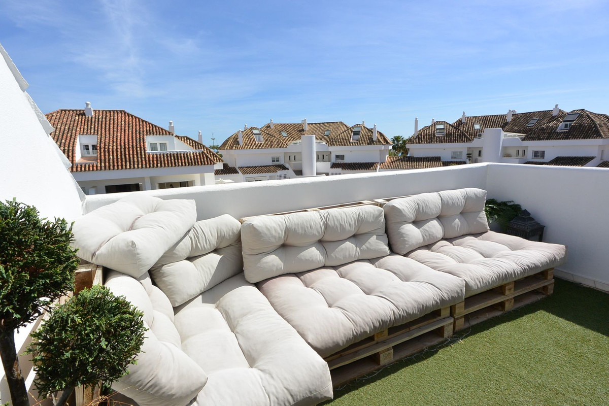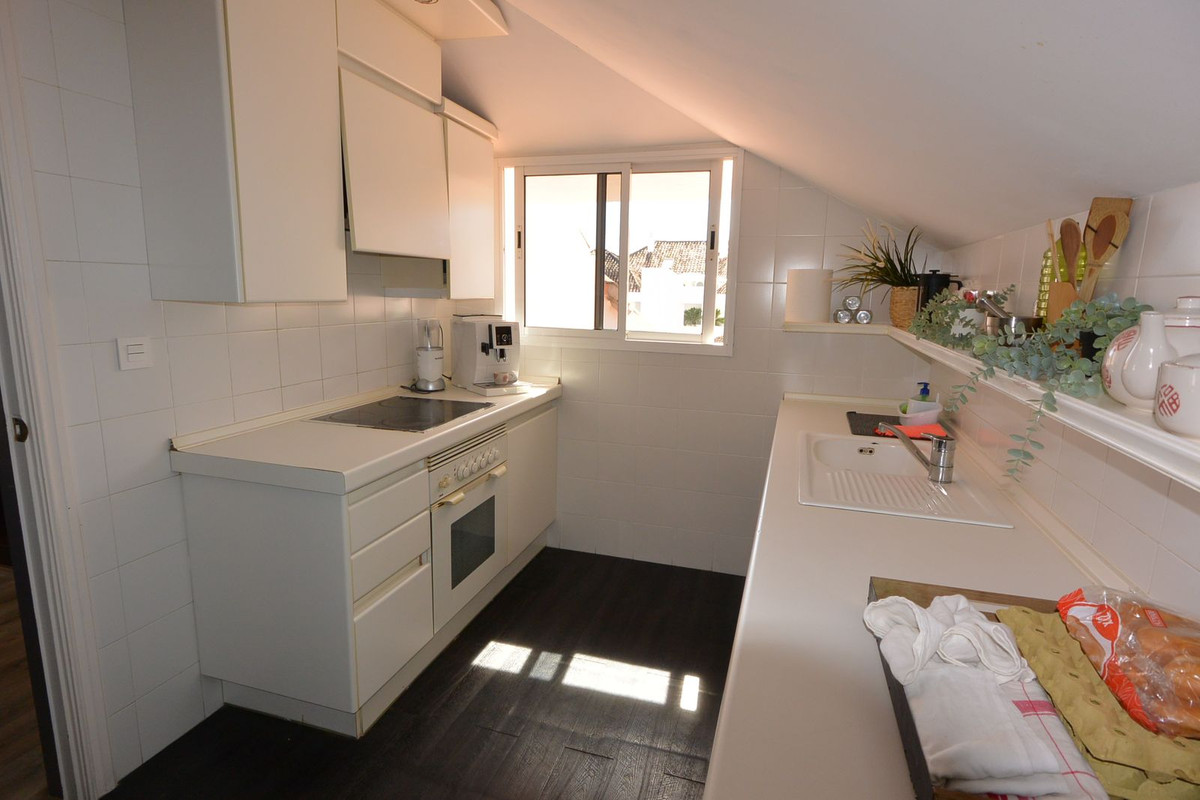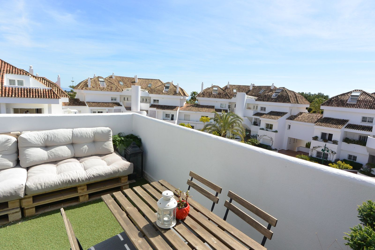 The apartment consists of an entrance hall, from which stairs lead to the first floor which comprises of a comfortable living room with dining area, a fully fitted kitchen, two bedrooms and two en suite bathrooms. From the living room and the master bedroom there is access to the south and east facing terrace with beautiful panoramic views to the mountains and garden of the urbanization, ideal for a wonderful and comfortable holiday at 5 minutes from Puente Romano and the best services of Marbella.