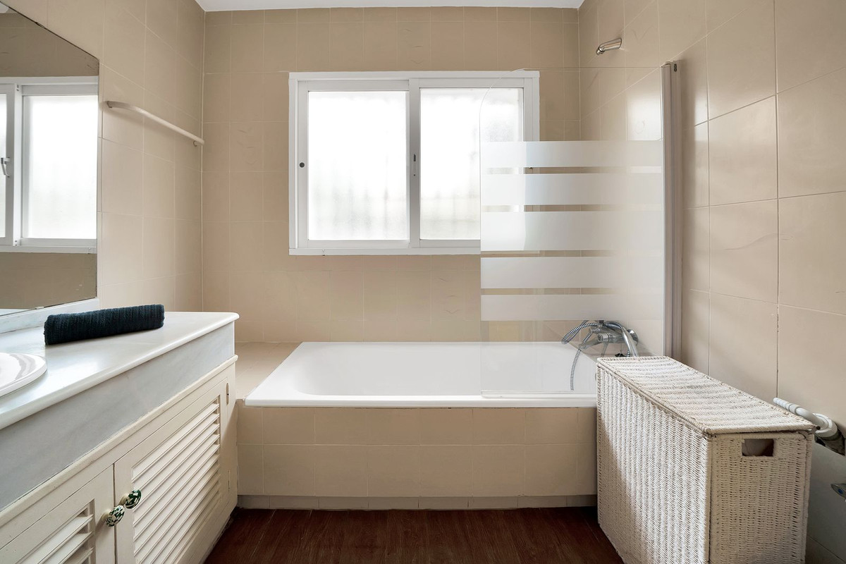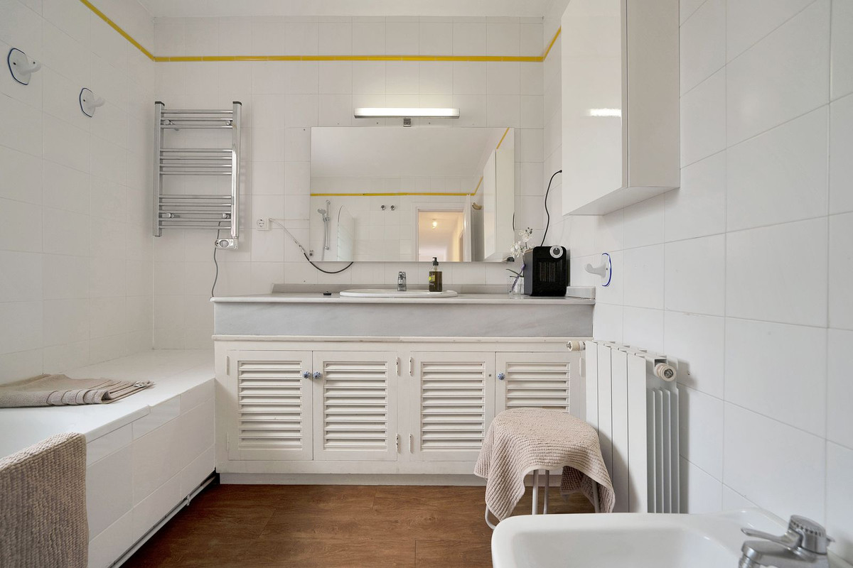 At entrance level: hall with toilet, fully equipped kitchen, spacious living room and conservatory with wooden ceiling, 3 bedrooms, 2 bathrooms.