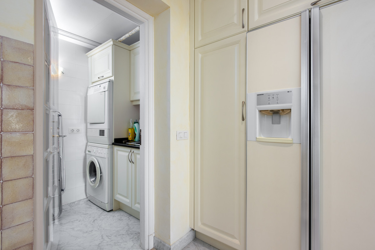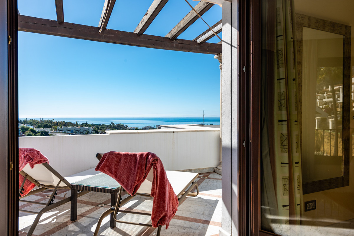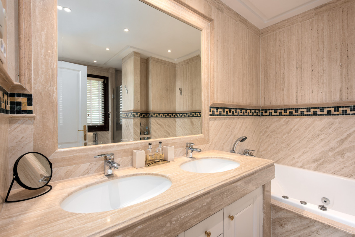 Spacious first floor apartment with panoramic sea views, three double ensuite bedrooms, a large lounge, separate kitchen and utility room, as well as a large terrace. Centrally located within a high end urbanisation within walking distance of the amenities of Marbella old town, in one of the best areas of the Costa del Sol, the apartment boasts impressive views, and oversize rooms throughout.