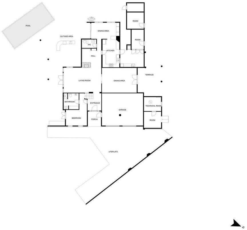 Convenient amenities include a garage for two cars, a driveway with space for eight cars, multiple storage rooms, a boiler room, technical room with an alarm system, and a separate room for pool equipment. The property is heated by solar panels, heat pumps, and gas.