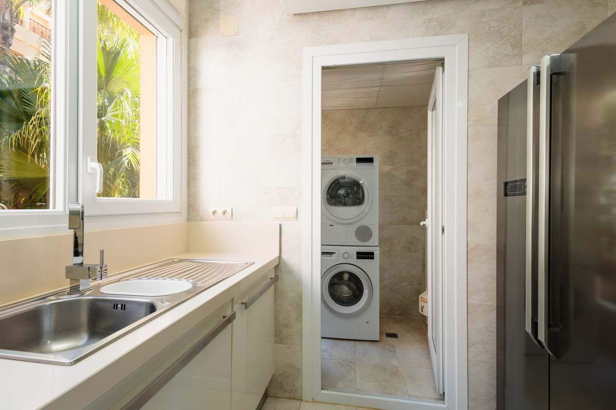 The kitchen is fully equipped with microwave, two-door refrigerator, oven, dishwasher, kettle, toaster, etc. In the same kitchen there is a room where the washing machine is and a large space for the iron.