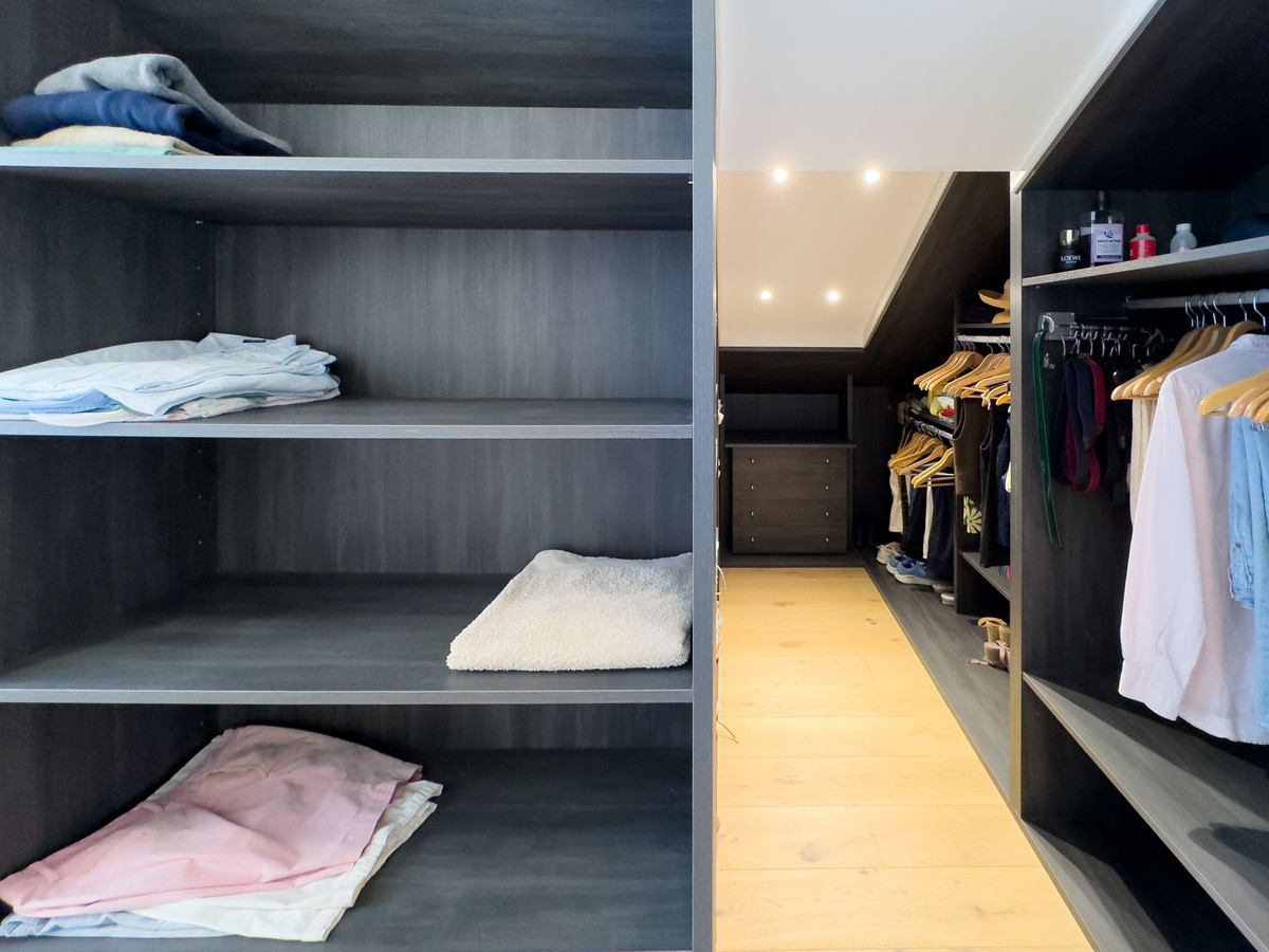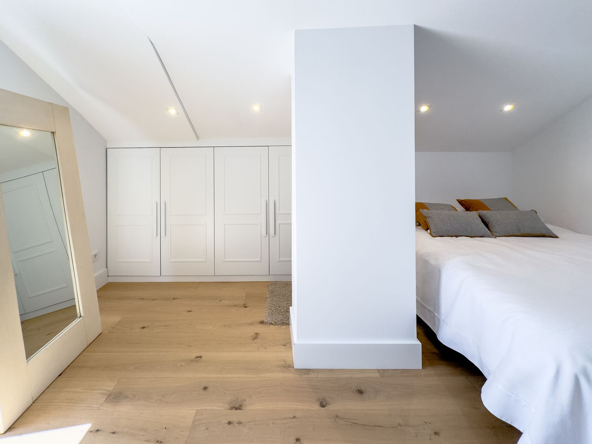Upon entering the penthouse, you are greeted with a sense of brightness and spaciousness thanks to its contemporary design and expansive windows that allow natural light to flow into every corner. The main floor hosts two elegantly decorated rooms, perfect for hosting guests or transforming them into work or study spaces according to your needs. It also includes a storage room under the staircase.