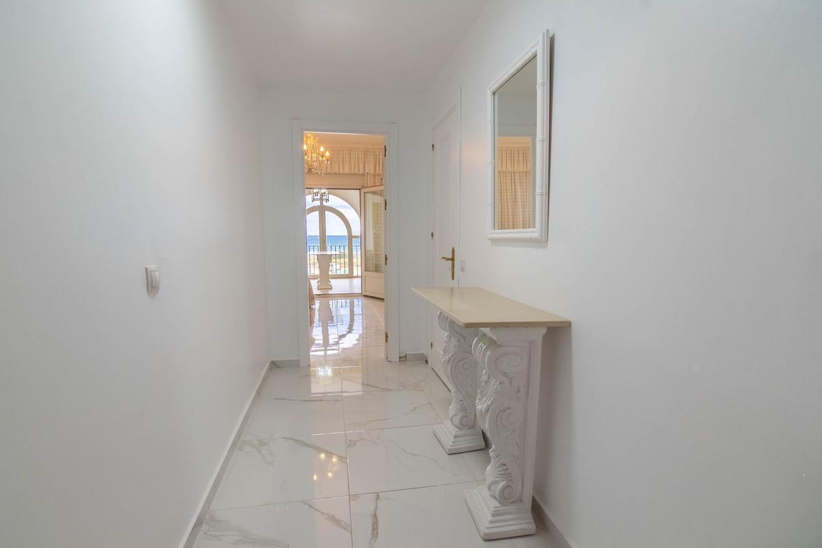 As you step inside, a fully fitted kitchen welcomes you, leading into a vast, open-plan lounge and dining area adorned with elegant white marble floors, a cozy fireplace, and expansive patio windows. These open onto a charming terrace that boasts breathtaking panoramic views of the sea and Estepona Marina—a perfect spot for enjoying the best of outdoor living with sun all day long.