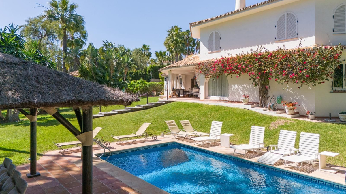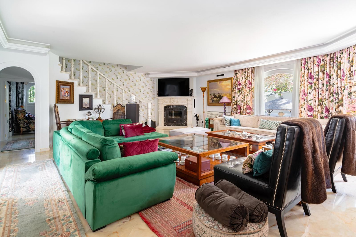 The villa is in a perfect state of preservation despite maintaining its aristocratic Marbella feel and offers a fully equipped and recently renovated kitchen, a separate dining room connected to a cosy living room with a large fireplace. A majestic classical style staircase leads to the first floor, where there are two spacious en suite bedrooms, one of them with access to a private terrace overlooking the garden and La Concha.