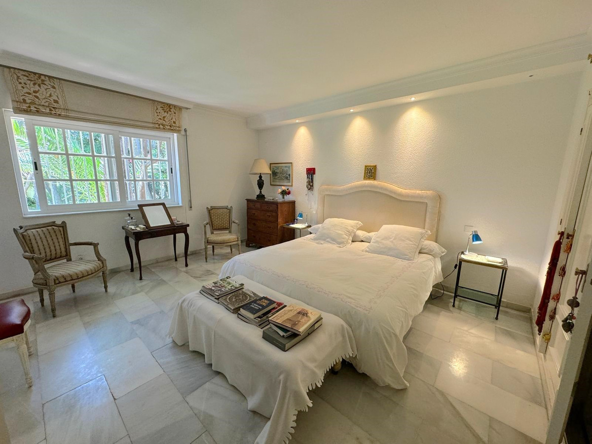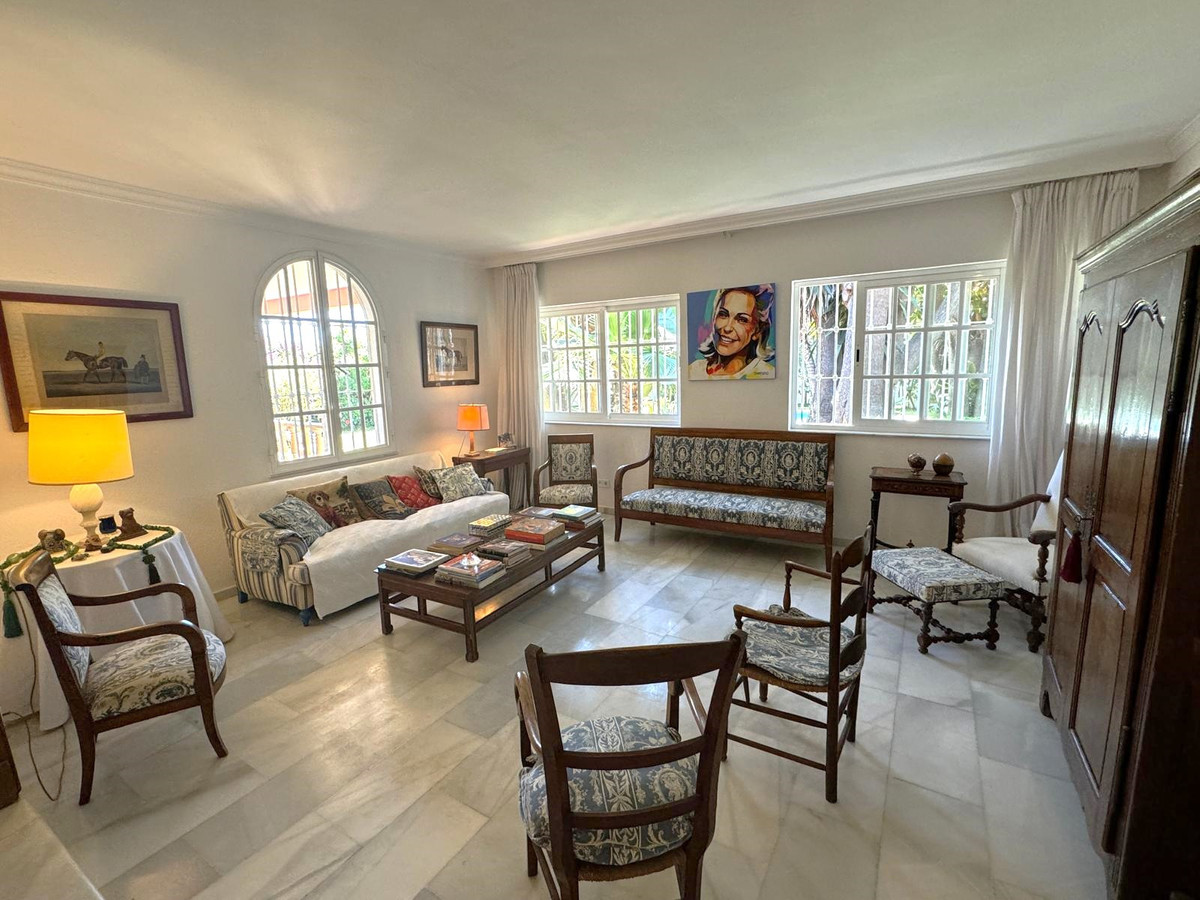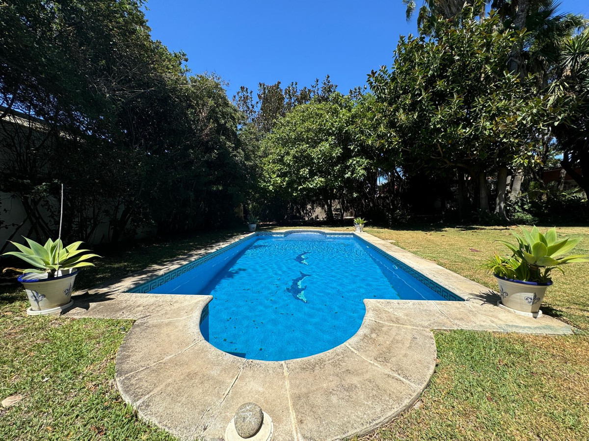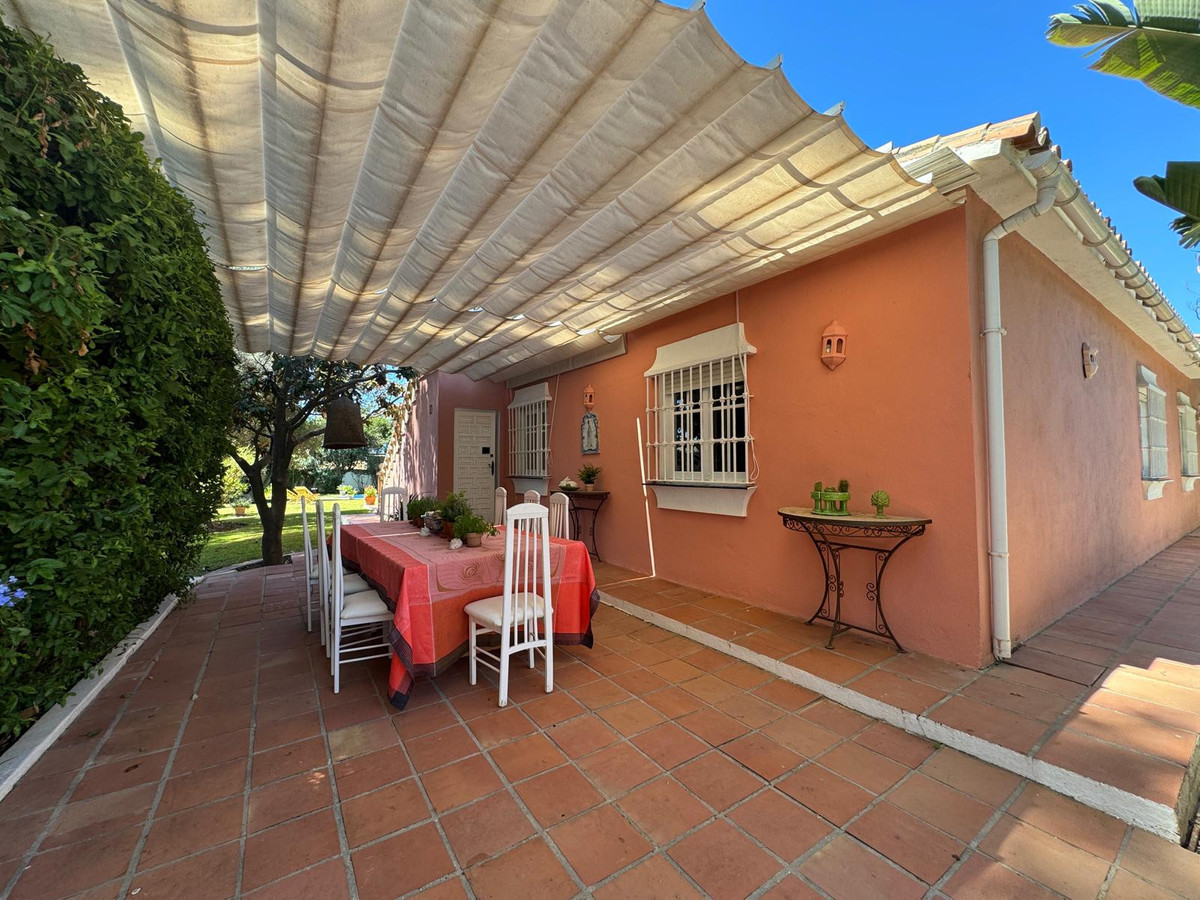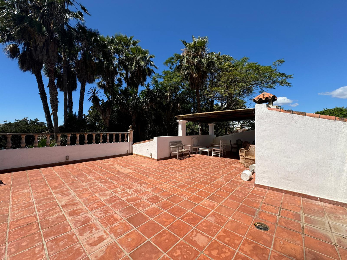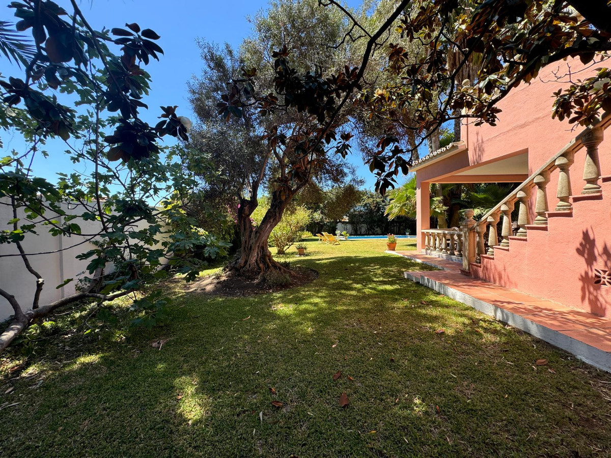 Beautiful family villa with a lot of charm located on the second line of the beach the well established urbanisation Linda Vista Baja, San Pedro de Alcántara. Built on a single floor, on a beautiful plot it has a very nice mature garden, with tropical plants and fruit trees. Due to its magnificent position, it is a very interesting renovation proyect. Just a few minutes walk to all kinds of services such as restaurants, international schools and shops. South facing, with beautiful views of the sea and to the mountains from the roof terrace. It consists of: cozy covered porch very privated with views to the garden. Spacious living room with dining area and fireplace, large fully equipped kitchen with breakfast area and laundry room. In total there are 6 double bedrooms with built-in cupboards + 1 maid's bedroom and 3 bathrooms. The master bedroom is very spacious with its en-suite bathroom and office. Maid's room with shower room. On the East side of the house, there is a very cozy patio, ideal as a summer dining room for the whole family covered with awnings. Private garage and outdoor parking area for several cars. Air-conditioning. Solar panels.