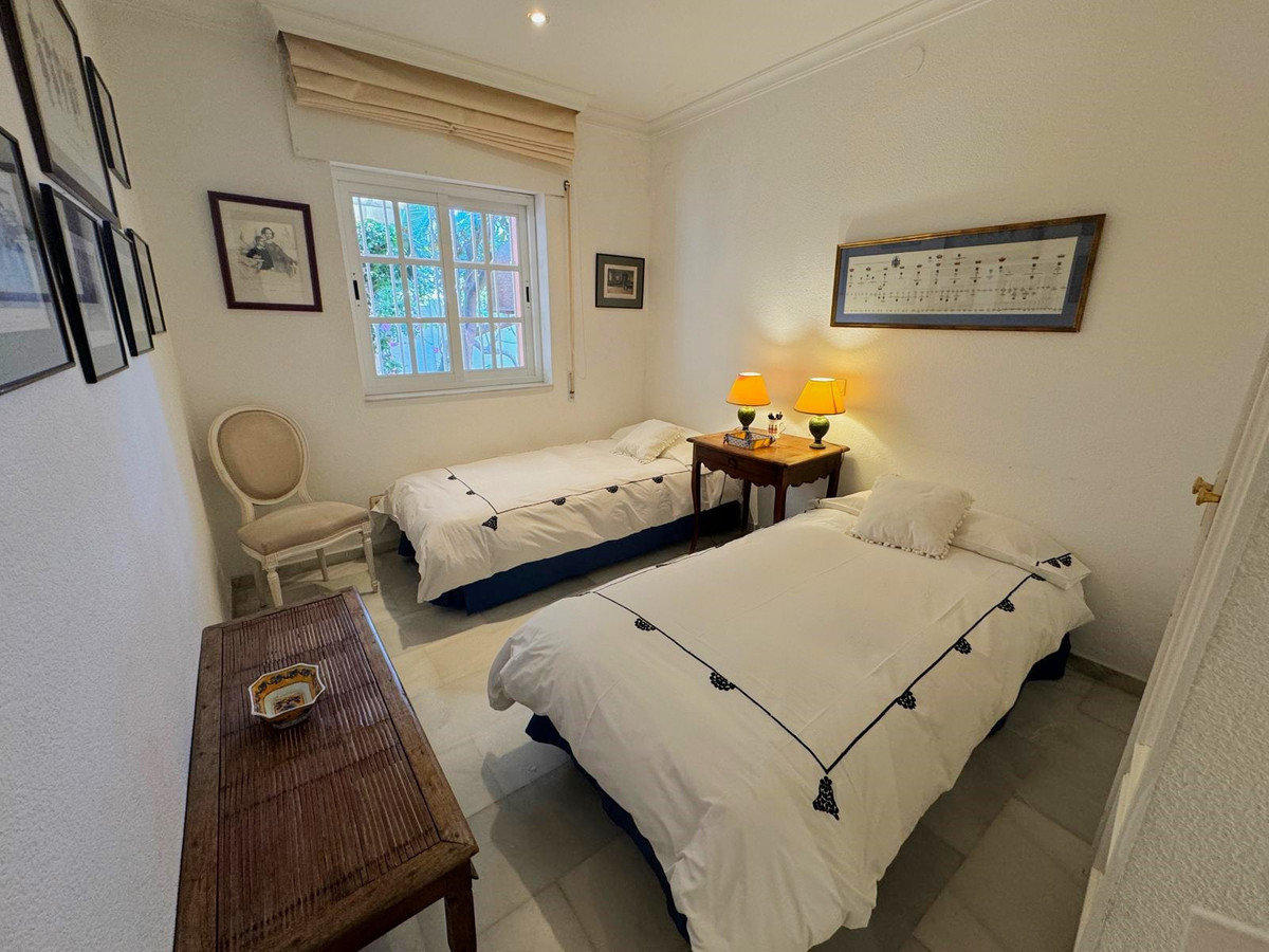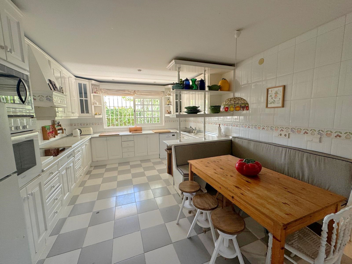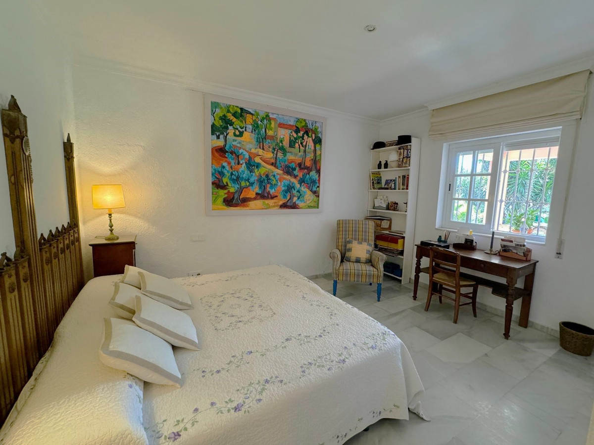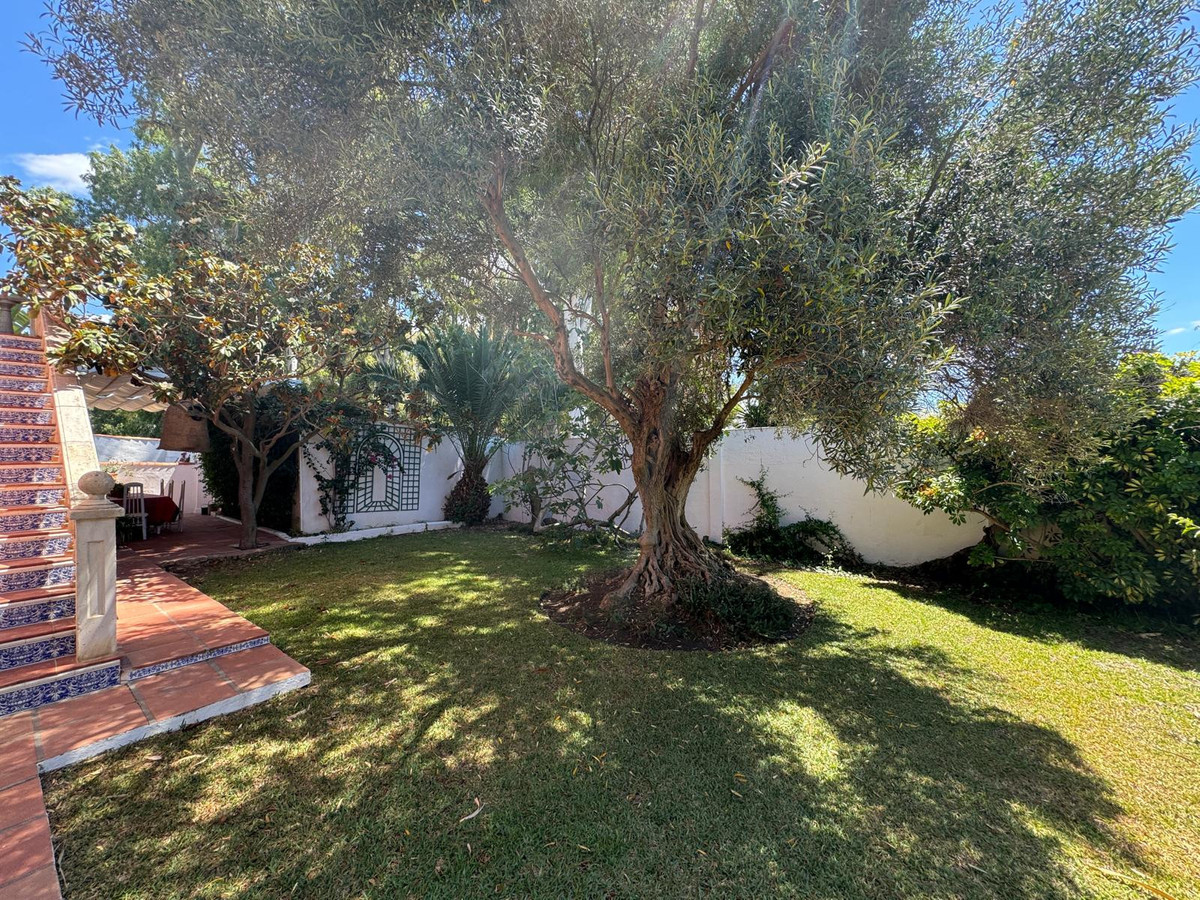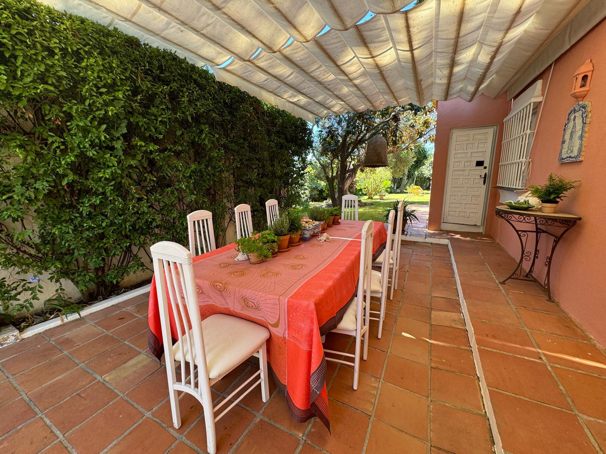 Beautiful family villa with a lot of charm located on the second line of the beach the well established urbanisation Linda Vista Baja, San Pedro de Alcántara. Built on a single floor, on a beautiful plot it has a very nice mature garden, with tropical plants and fruit trees. Due to its magnificent position, it is a very interesting renovation proyect. Just a few minutes walk to all kinds of services such as restaurants, international schools and shops. South facing, with beautiful views of the sea and to the mountains from the roof terrace. It consists of: cozy covered porch very privated with views to the garden. Spacious living room with dining area and fireplace, large fully equipped kitchen with breakfast area and laundry room. In total there are 6 double bedrooms with built-in cupboards + 1 maid's bedroom and 3 bathrooms. The master bedroom is very spacious with its en-suite bathroom and office. Maid's room with shower room. On the East side of the house, there is a very cozy patio, ideal as a summer dining room for the whole family covered with awnings. Private garage and outdoor parking area for several cars. Air-conditioning. Solar panels.