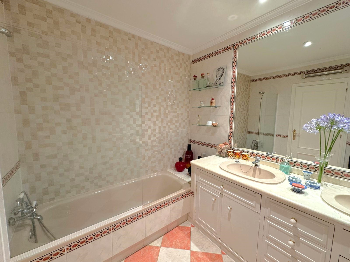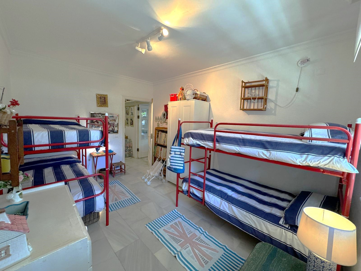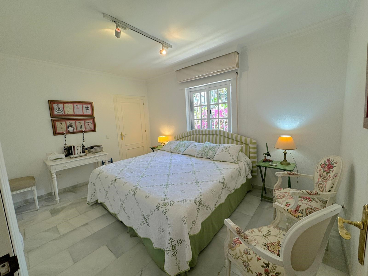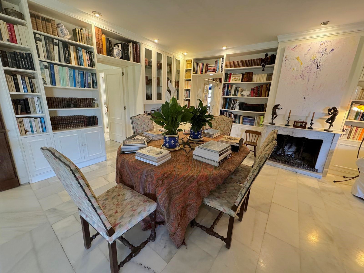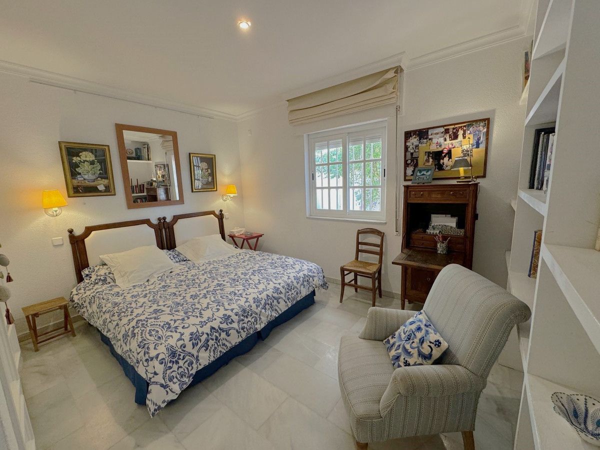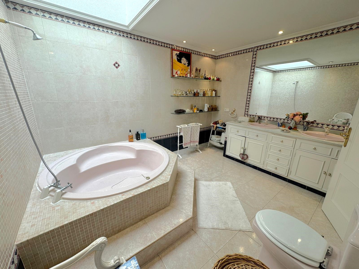 Beautiful family villa with a lot of charm located on the second line of the beach the well established urbanisation Linda Vista Baja, San Pedro de Alcántara. Built on a single floor, on a beautiful plot it has a very nice mature garden, with tropical plants and fruit trees. Due to its magnificent position, it is a very interesting renovation proyect. Just a few minutes walk to all kinds of services such as restaurants, international schools and shops. South facing, with beautiful views of the sea and to the mountains from the roof terrace. It consists of: cozy covered porch very privated with views to the garden. Spacious living room with dining area and fireplace, large fully equipped kitchen with breakfast area and laundry room. In total there are 6 double bedrooms with built-in cupboards + 1 maid's bedroom and 3 bathrooms. The master bedroom is very spacious with its en-suite bathroom and office. Maid's room with shower room. On the East side of the house, there is a very cozy patio, ideal as a summer dining room for the whole family covered with awnings. Private garage and outdoor parking area for several cars. Air-conditioning. Solar panels.