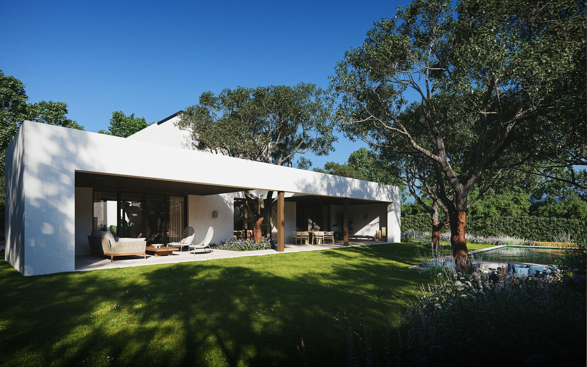 Luxurious modern villa among cork trees, featuring 4 ensuite bedrooms, an open-plan kitchen, large living area, and extensive outdoor amenities.