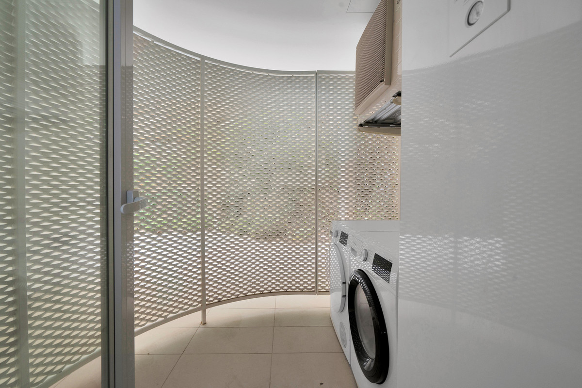 The open and modern kitchen is fully equipped with high-standard appliances. A small, covered laundry area with a washing machine and dryer is connected to the kitchen.
