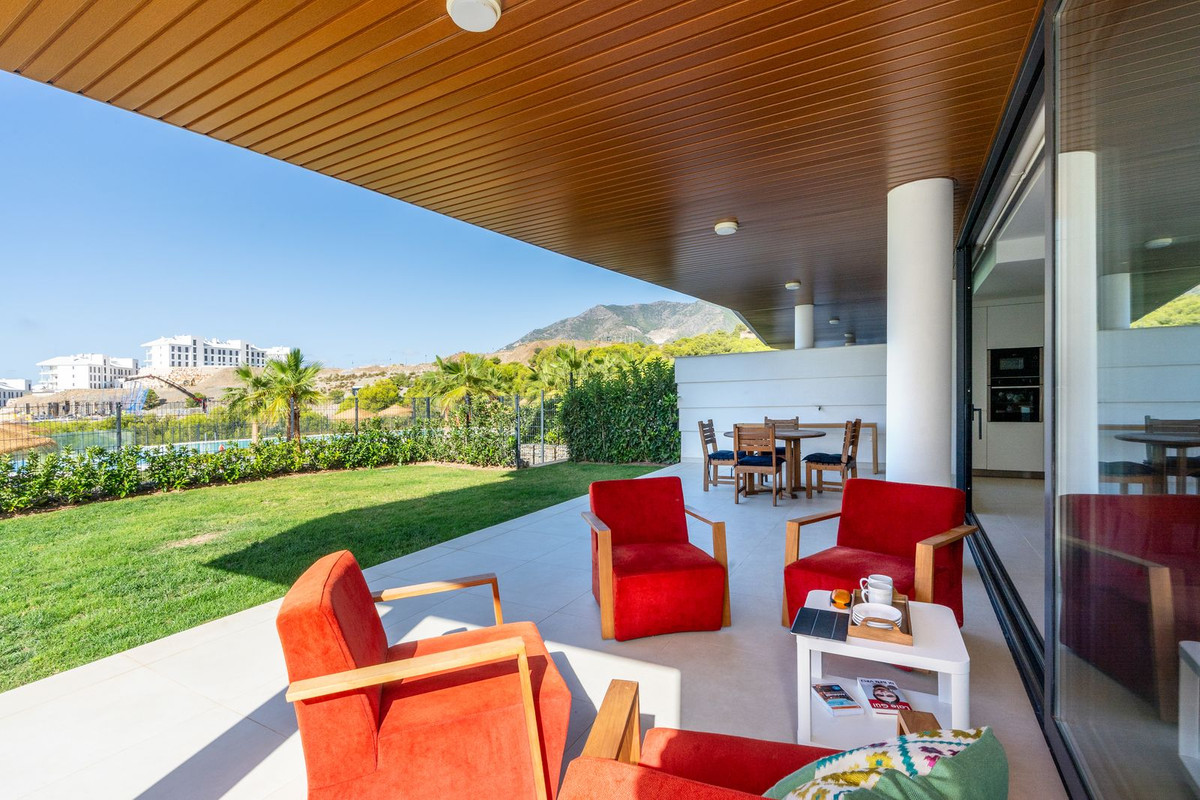 The large sliding doors provide easy access to the sunny terrace and also offer direct access to the luxurious adjacent saltwater swimming pool plus children's pool, you will experience peace and child friendliness here. The whole is situated in a subtropical garden surrounded by palm trees, sunbathing areas with sun beds and outdoor showers with views over the Mediterranean Sea and the mountains of Mijas.