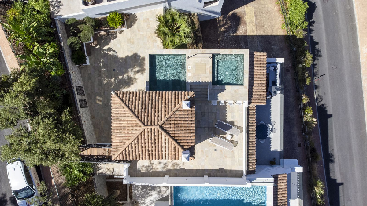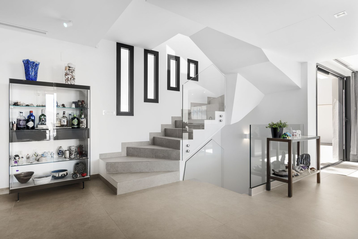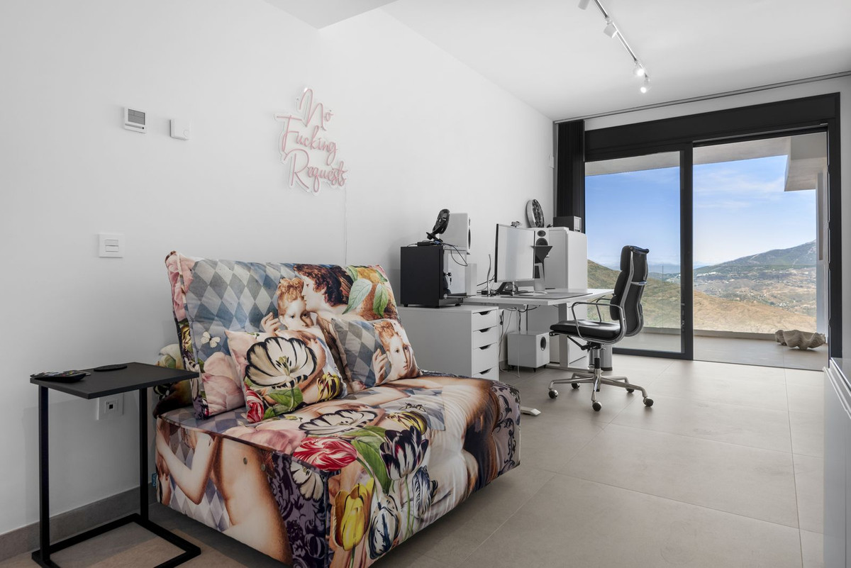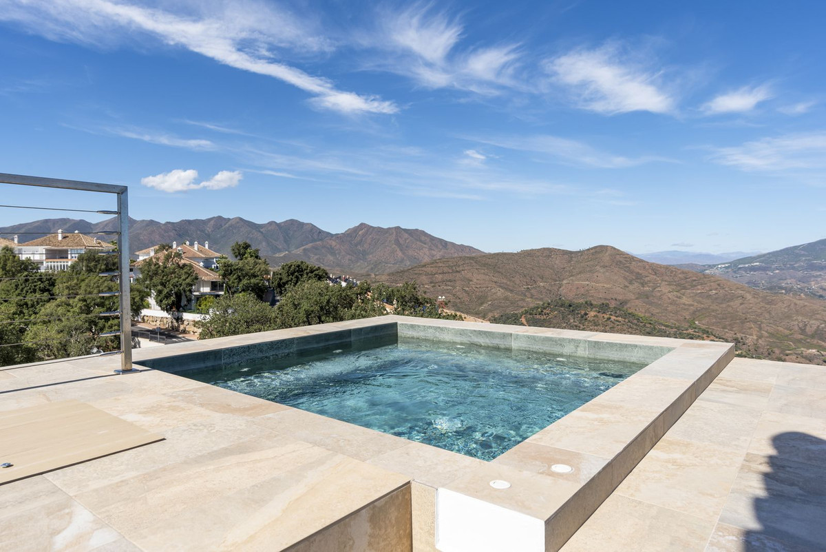 The top level is your personal outdoor oasis. This sun-soaked terrace is designed for relaxation, featuring a jacuzzi, plunge pool, and a bar area. Whether hosting guests or enjoying a quiet evening, the spectacular views of the UNESCO-protected Sierra Alpujata and the charming village of Mijas, sunrise over the Mediterranean in the west, and sunset over the national park ‘Sierra de las Nievas to the east. There’s also a guest toilet and a pedestrian bridge providing quick and convenient street access and parking from this level.