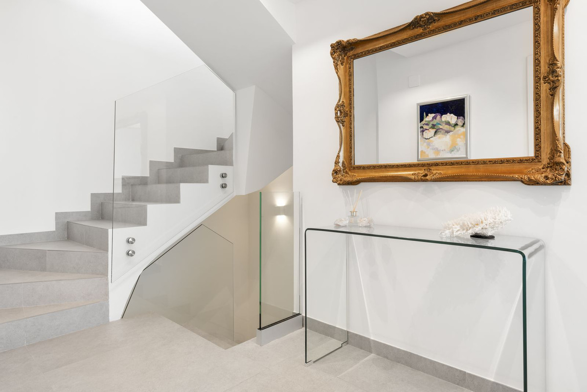 The second floor is an entertainer’s dream! The expansive, open-plan kitchen, dining, and living area is the heart of the home. The high-end kitchen boasts top-tier NEFF appliances known for their elegance, quality, and functionality. Floor-to-ceiling glass doors in the living room flood the space with natural light and lead out to a large terrace, blending indoor and outdoor living seamlessly. The terrace features automatic awnings and showcases yet another breathtaking view. Behind the living area, you'll find a hidden gem: a large private patio, beautifully landscaped around a mature olive tree, offering a peaceful retreat.