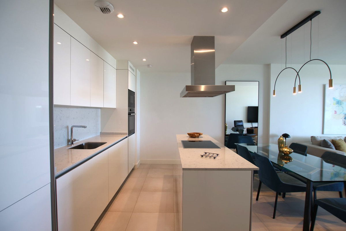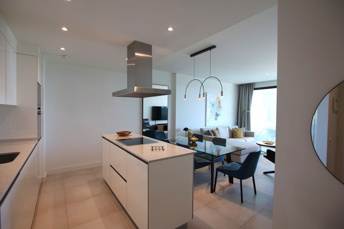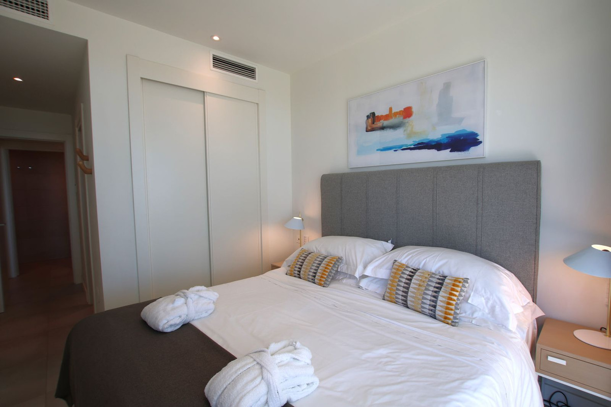 The apartment has two bedrooms and two bathrooms, with a modern, open plan kitchen fitted with Miele appliances. The lounge area is open and bright thanks to its large windows opening on to a large south, south-west facing terrace with beautiful views to the sea. The community is gated and secure with a video entry system, a heated pool during the winter months and another large walk-in swimming pool. There is also a gym and a turkish bath and sauna.