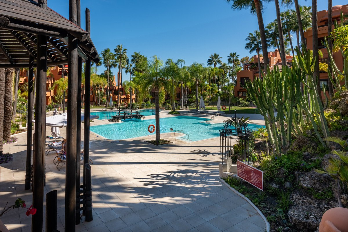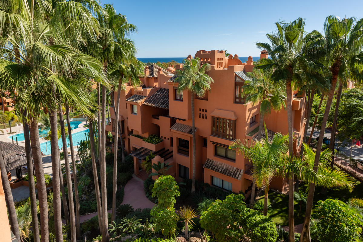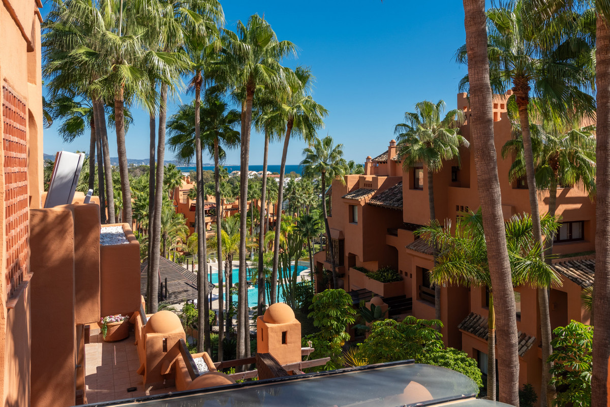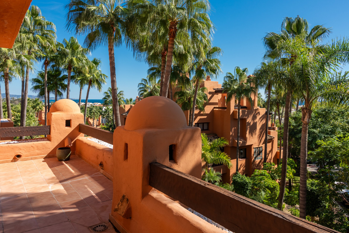 Extensive and immaculate - three bedroom duplex penthouse with considerable terraces and sea views, in a well run community close to Puerto Banús.