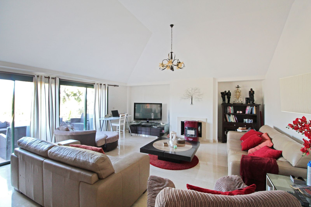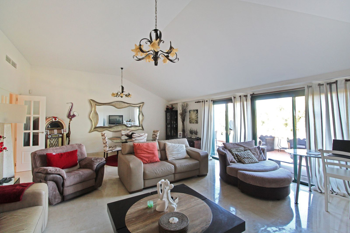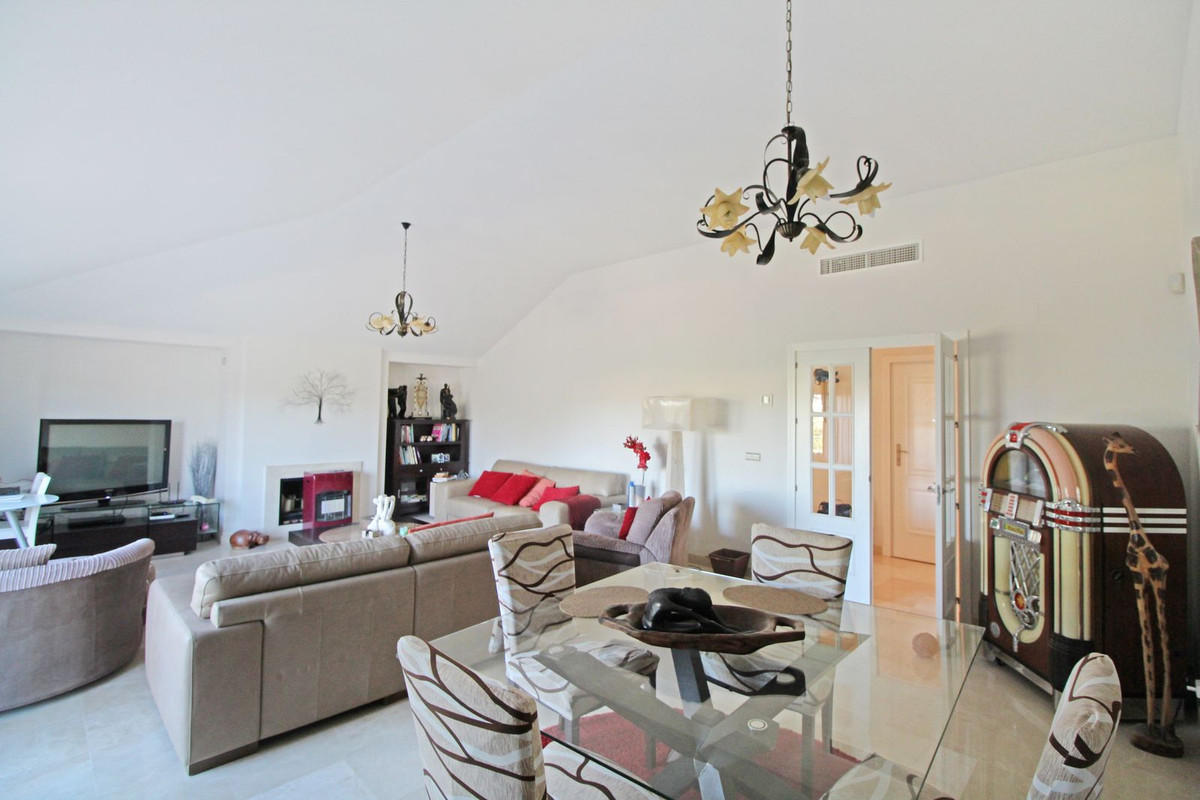 Experience the refined lifestyle at San Roque Club with this beautiful 2-bedroom, 2-bathroom penthouse, positioned frontline to the golf course. The expansive living and dining area features a cozy fireplace, a vaulted ceiling, and large sliding doors that open to a spacious terrace with panoramic views over the prestigious Old Course.