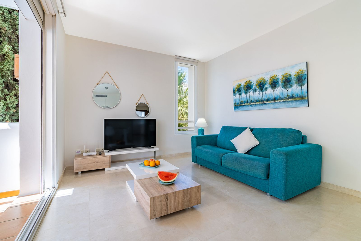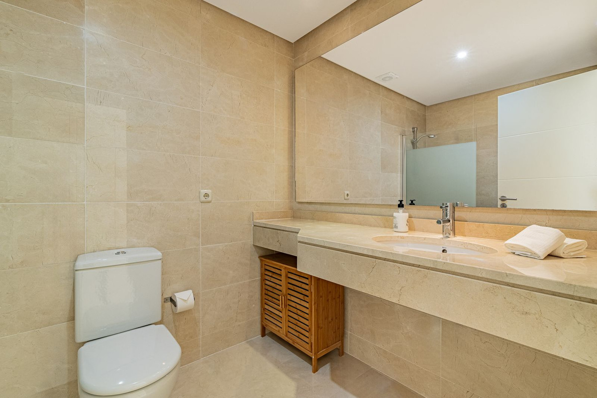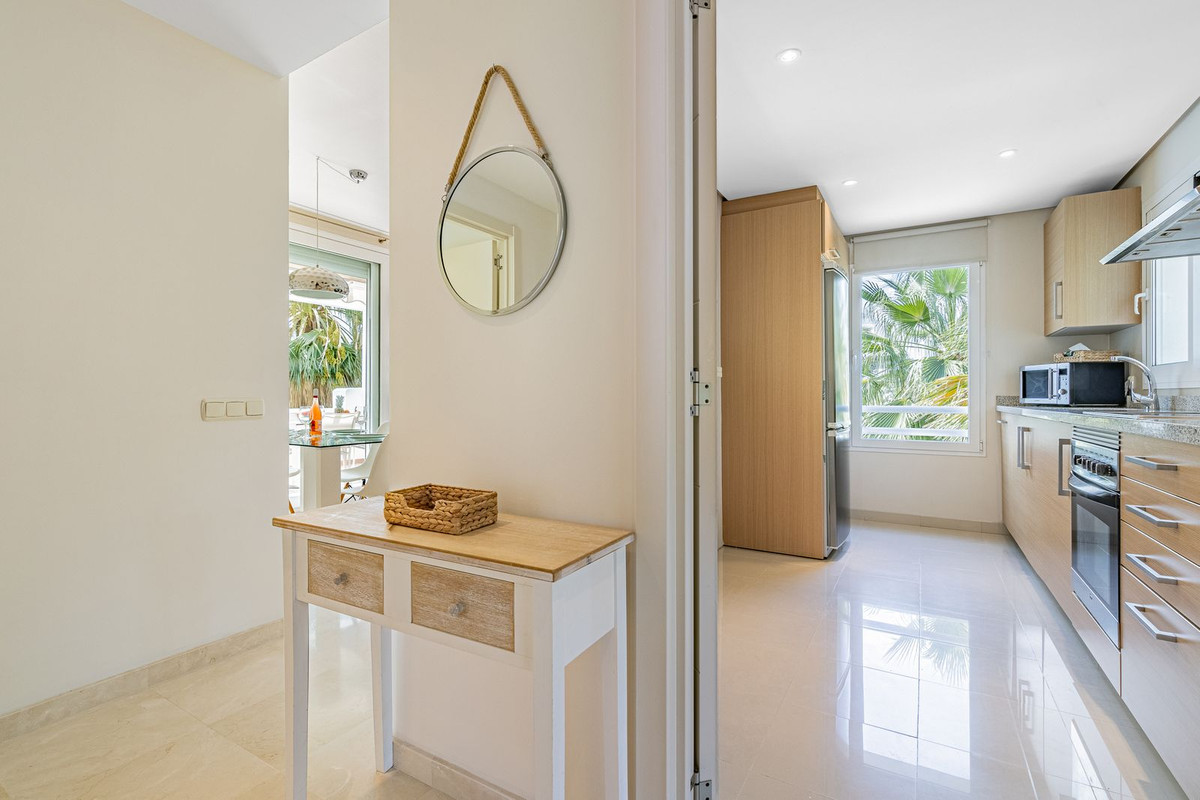Designed to a high standard of quality and elegance, this flat features ample built-in wardrobes and an efficient hot/cold air conditioning system to ensure year-round comfort. The clever layout includes two bedrooms, one with en-suite bathroom, and an additional guest toilet. The heart of the property is undoubtedly its spacious living room, flooded with natural light thanks to its large glass doors. The kitchen, fully equipped with high quality appliances, offers an ideal environment for the home chef.