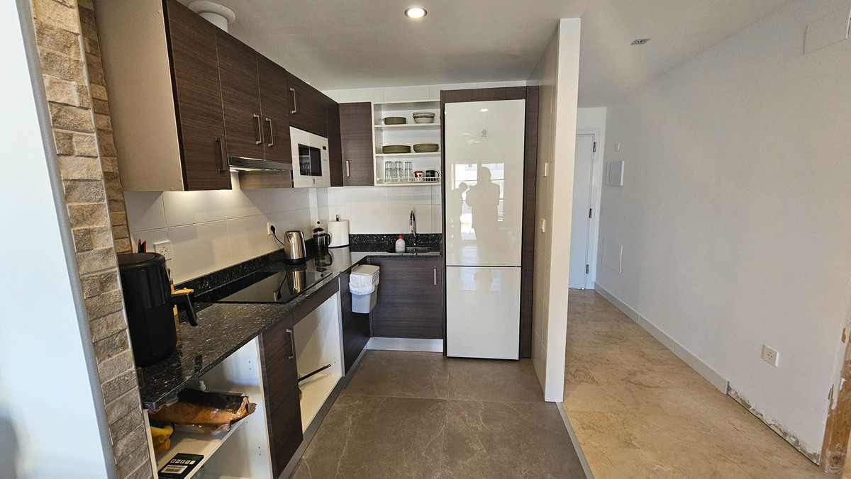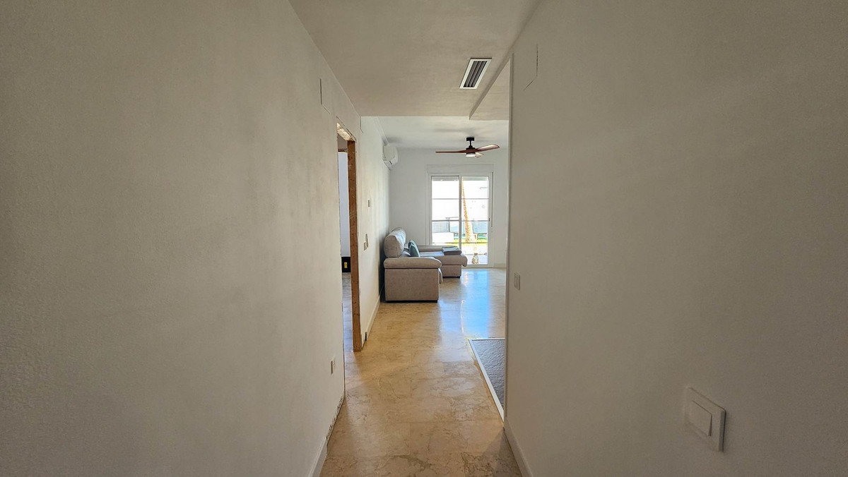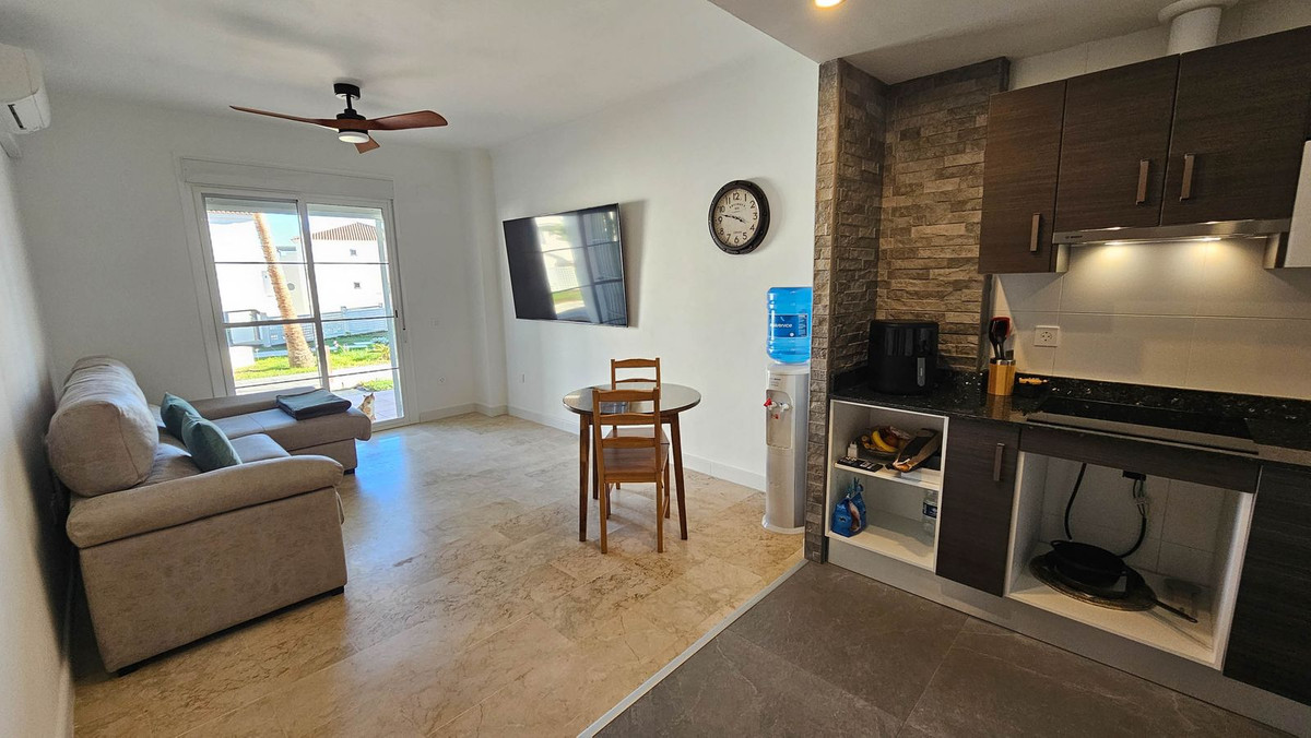 Welcome to the luxurious apartments of Pequeño Oasis! This east-facing ground floor property is a real gem: with sea views, marble floors, central air conditioning system, two spacious bedrooms, a very modern bathroom and the newly renovated kitchen with sophisticated dark granite countertops. The open kitchen is equipped with contemporary appliances, storage spaces and elegant finishes, perfect for both daily cooking tasks and entertaining guests. Large windows flood the living room with natural light, creating a warm and welcoming atmosphere and giving access to the covered terrace, with views of the sea and the common areas of the residence. It also has a small private terrace in one of the two spacious bedrooms.