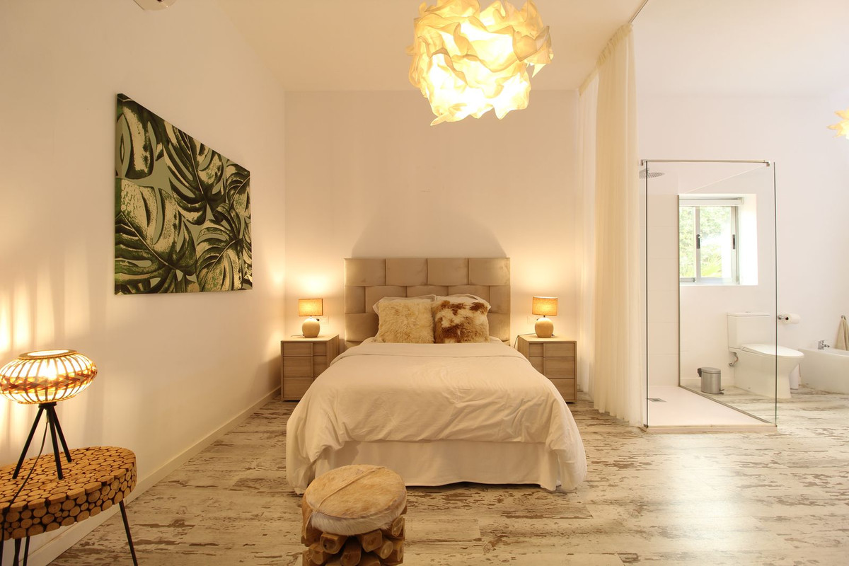 As you enter the welcoming hallway, you are immediately struck by the sense of openness, with the living area unfolding before you. To your left, the beautifully designed open kitchen exudes a natural Ibizan charm, a theme echoed throughout the villa.
