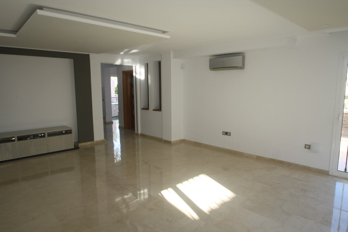 The second floor features the master bedroom with an en-suite bathroom and walk-in closet, along with two additional bedrooms and another bathroom with a shower. The basement is a versatile space with a multipurpose room, two additional rooms, a bathroom, and a large garage. Additionally, the 45 m² solarium is the ideal spot to enjoy the Mediterranean climate.