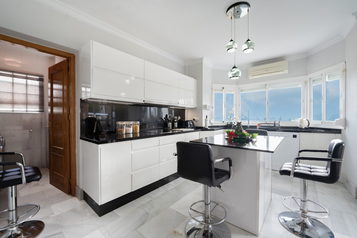 The kitchen, just off from the hallway, is clean-cut and streamlined, with a striking bay window that not only houses the sink in its unit but also offers a supreme vantage point from which you can enjoy Mediterranean Sea views. Natural light streams in to highlight every corner. Stylishly dressed in black and white, with an impressive island unit standing centre stage, this kitchen is any chefs idea of heaven. Four chic padded bar chairs offer a perfect place to enjoy a light breakfast whilst the first class appliances offer the promise of tastier meals to come.