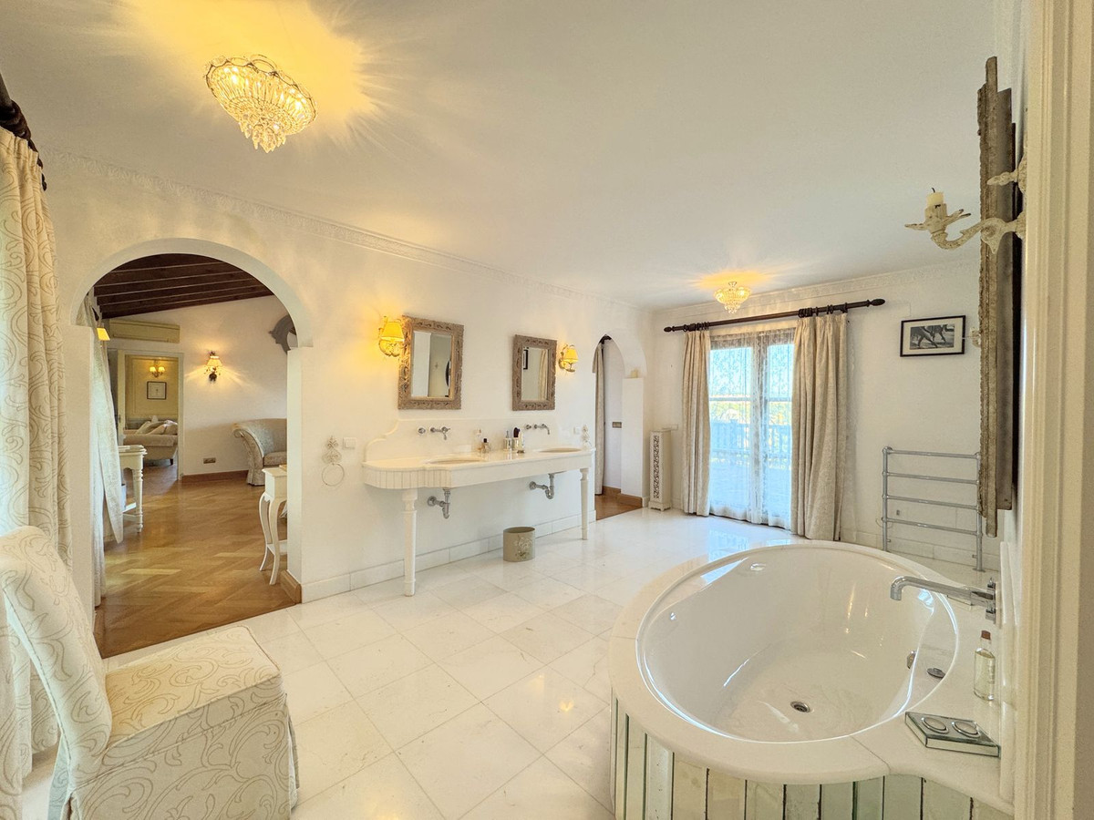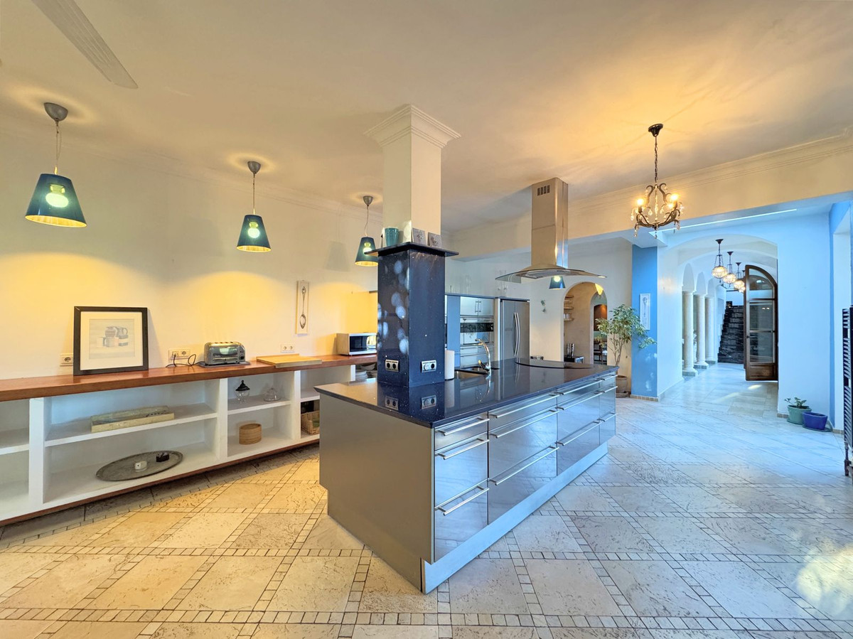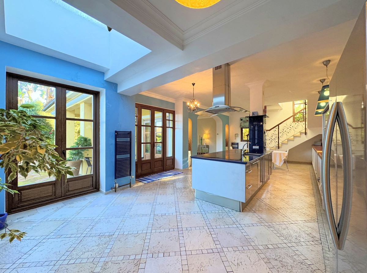 On the lower level, you will discover an environment designed for relaxation and conviviality. It includes a TV room with fireplace, a contemporary kitchen and a Moroccan-inspired dining room. All these areas connect directly to the terraces, the swimming pool and a beautiful garden, creating a perfect space to enjoy unforgettable moments outdoors.