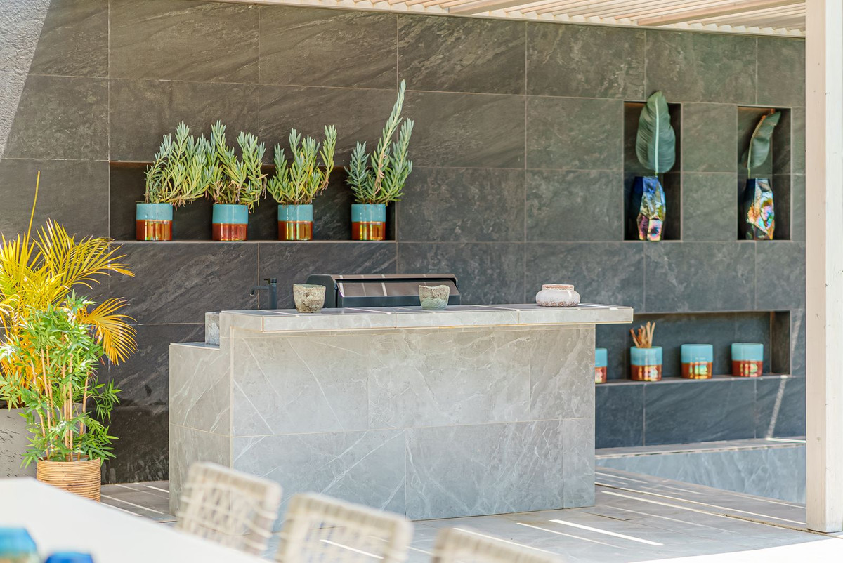 Ascend to the main floor, where you'll find a sleek, open-plan kitchen outfitted with top-of-the-line Gaggenau appliances. The living area seamlessly extends to an outdoor terrace, creating an idyllic indoor-outdoor living experience. Here, you can enjoy a refreshing dip in the pool, prepare meals in the outdoor kitchen, or unwind in the chill-out area by the fireplace.