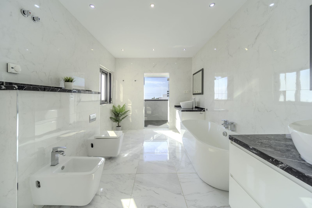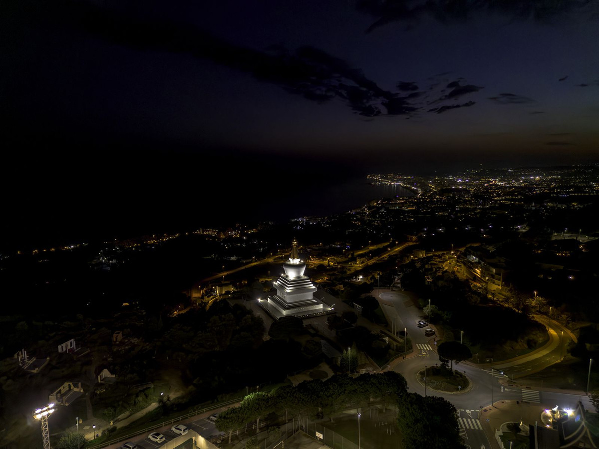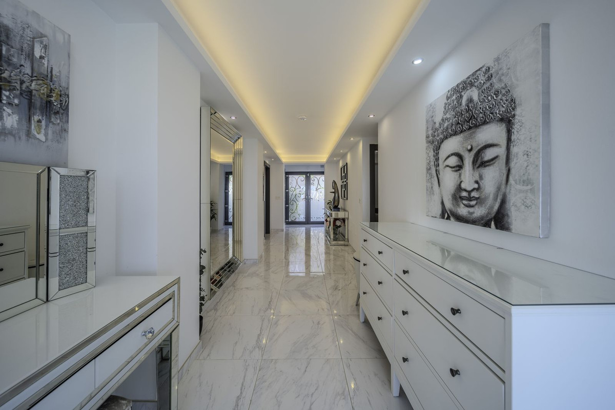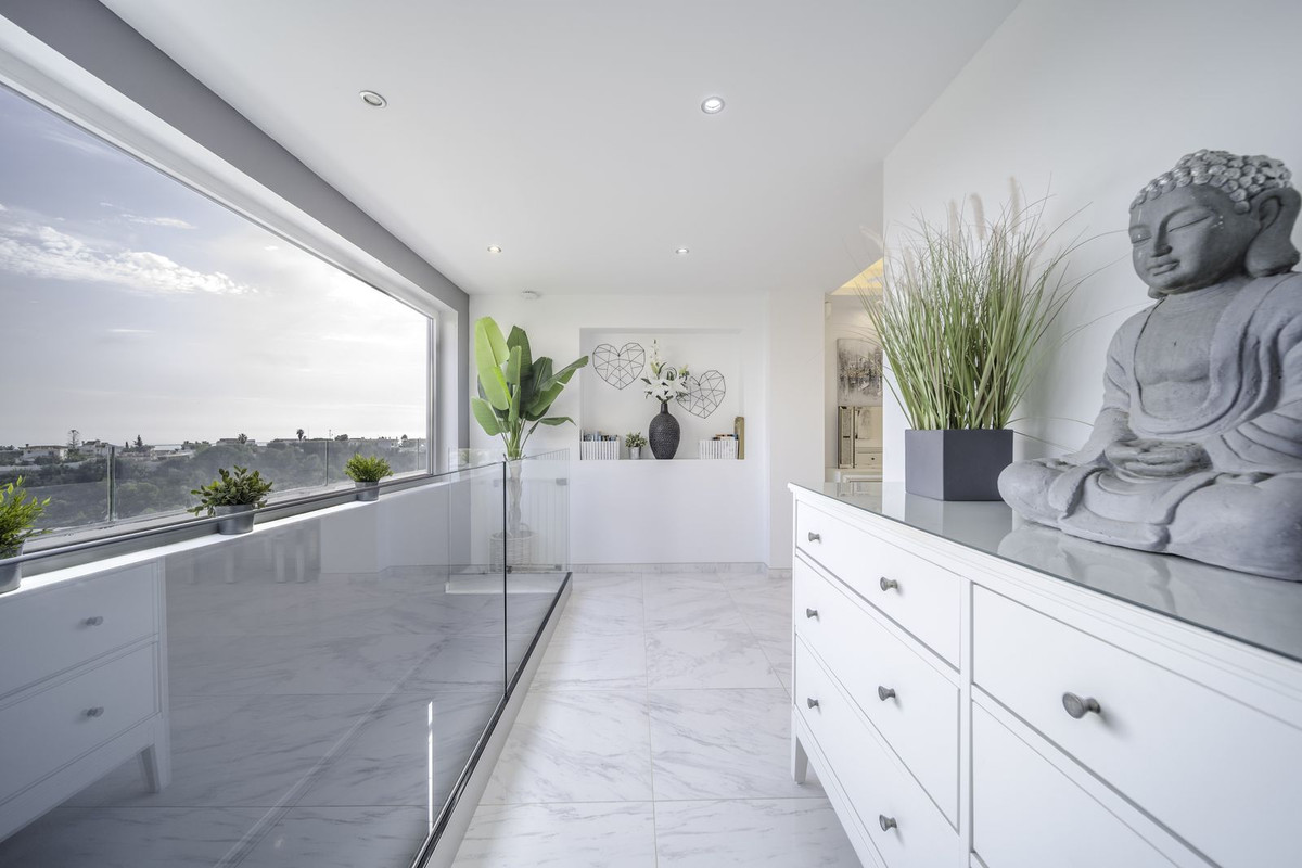 The villa’s exterior is a true oasis of luxury. It includes a *heated swimming pool, multiple chill-out zones strategically placed throughout the property, and a **jacuzzi with panoramic views of the sea and the iconic Buddhist stupa*. Every detail has been carefully crafted to provide relaxation and take full advantage of the sunny Costa del Sol climate.