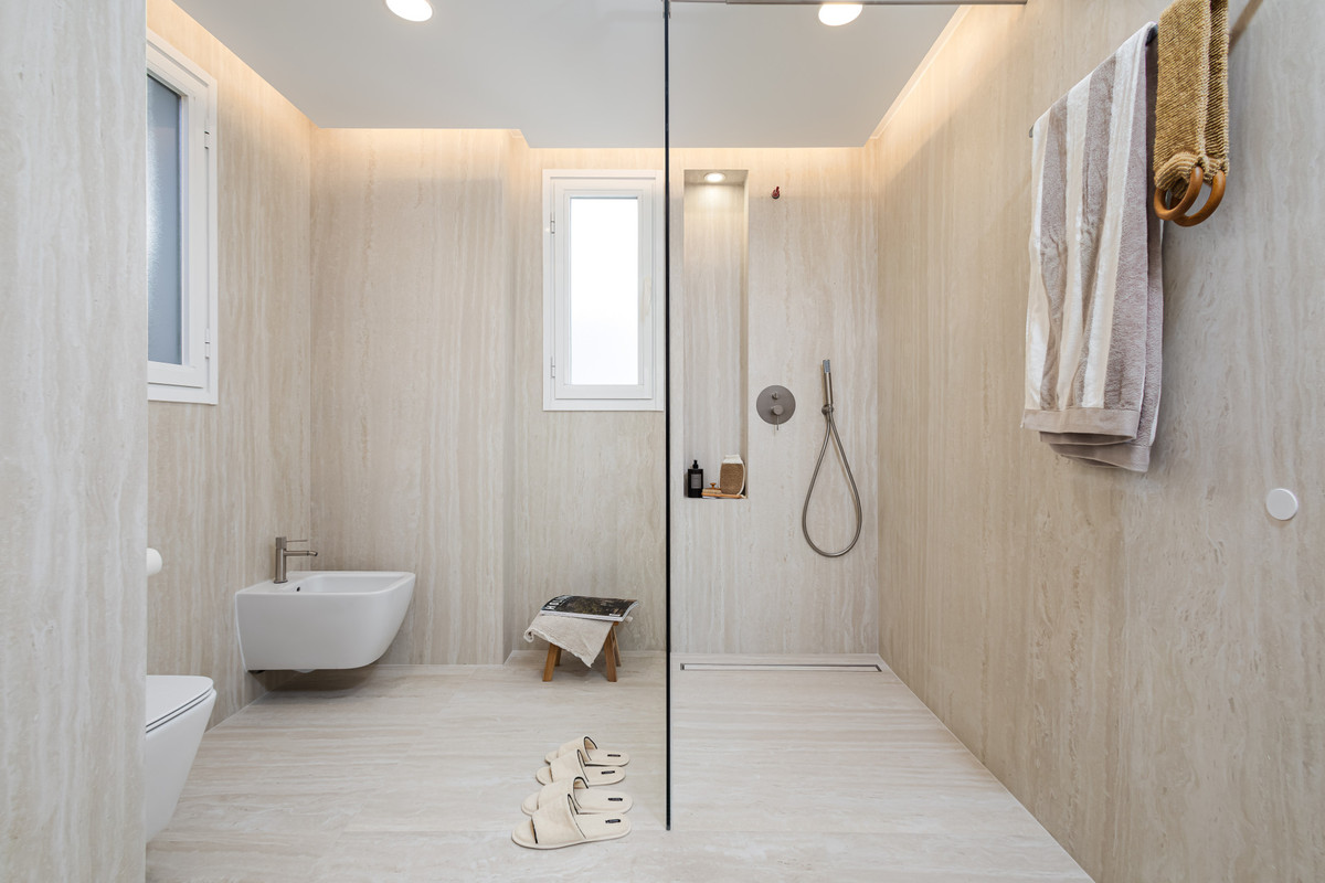 Meticulously renovated to the highest Scandinavian standards, this home features three generously sized bedrooms and two beautifully designed bathrooms. The interiors are flooded with natural light and decorated in calming, neutral tones that create an inviting atmosphere. The pièce de résistance is the spacious terrace, which comes complete with a cozy outdoor bathtub. From here, you can soak in panoramic views of the mountains, the shimmering sea, and the lush fairways of the surrounding golf course – the perfect setting for relaxation or entertaining.
