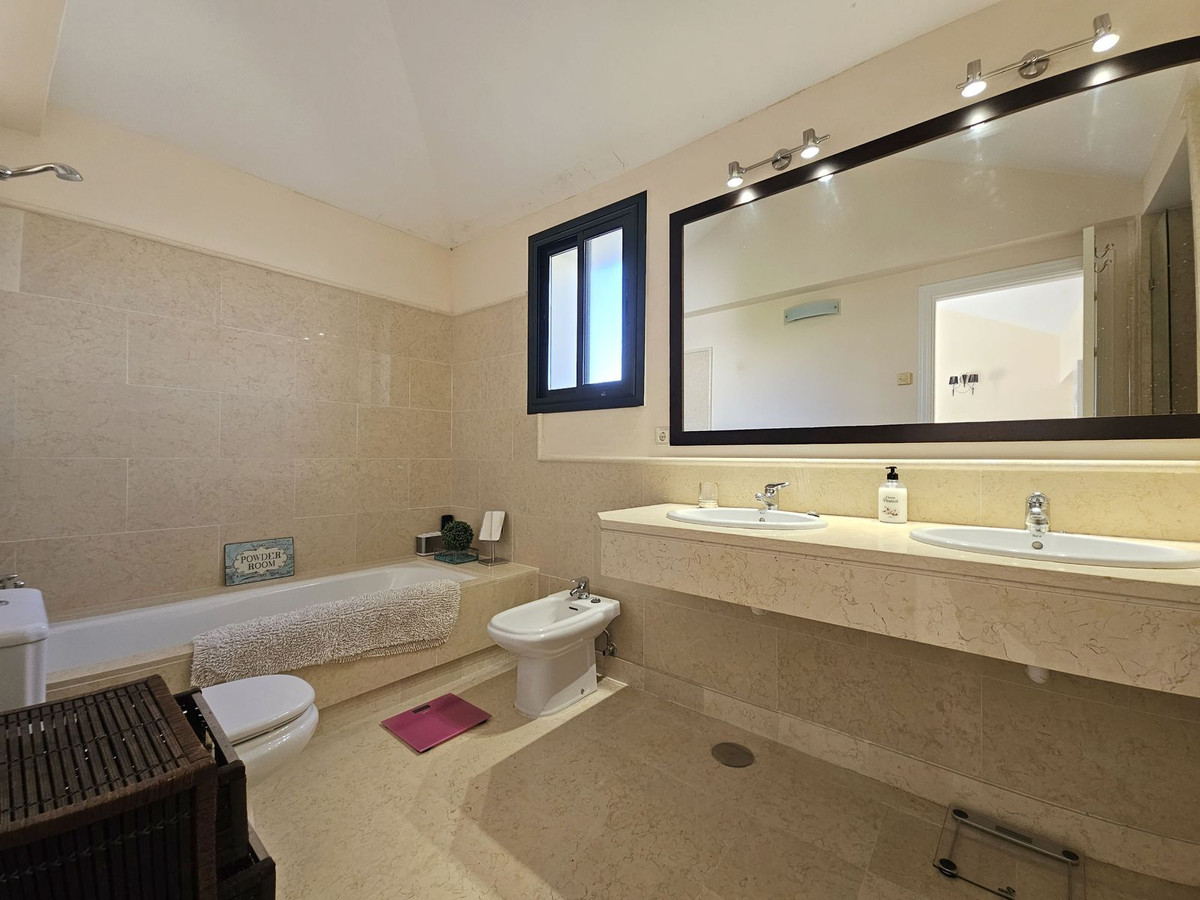 The open-plan living and dining area is bright and airy, leading to a large terrace that overlooks the lush greens of the golf course. The kitchen is modern and fully equipped, making it ideal for both entertaining and everyday living.