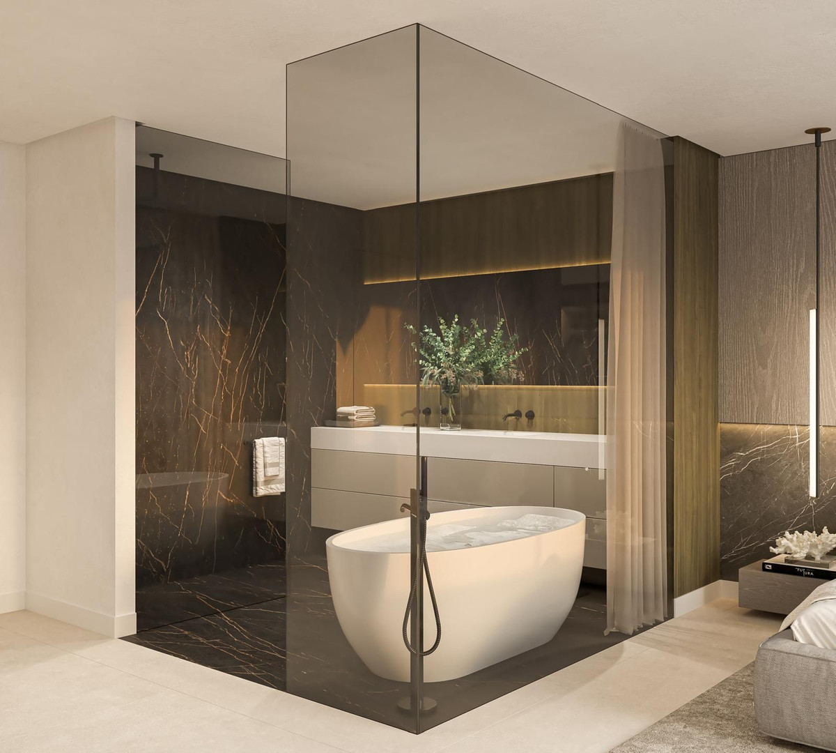 This property is been designed with the owner in mind, originally a four-bedroom property has now been made into a three-bedroom by opening up two bedrooms into one, resulting in one of the most awe-inspiring master bedrooms. With a 15 square meter custom made open wardrobe area, state of the art Porcelanosa bathroom suite, media TV wall with fire place, sea views of Africa from the bed, and a beautifully furnished full width private terrace. A further two double bedrooms and bathroom complete the first floor.