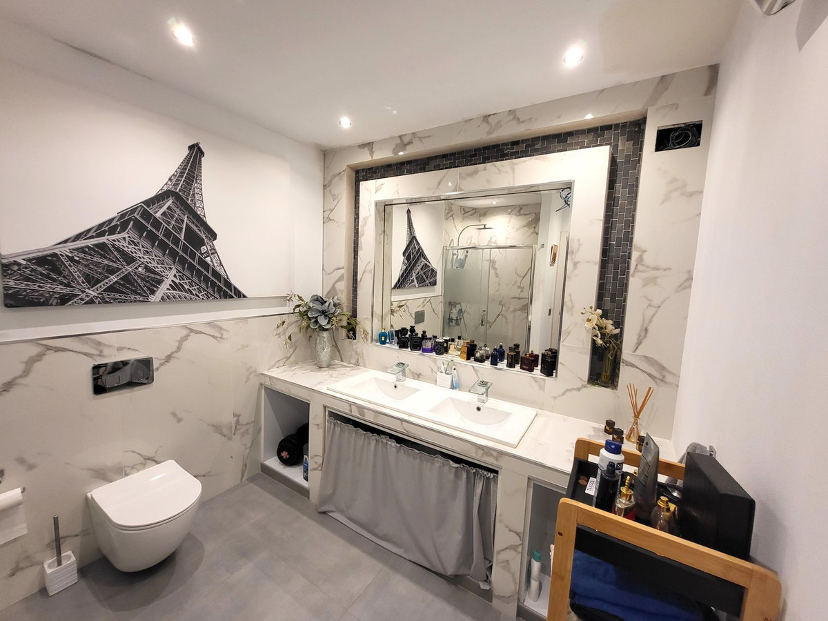 The lower floor, accessible from the main floor or directly through a charming patio with a barbecue and jacuzzi, offers a cozy living area, two bedrooms, a full bathroom, and an additional guest toilet. This space is ideal for guest privacy or as a family recreation area.