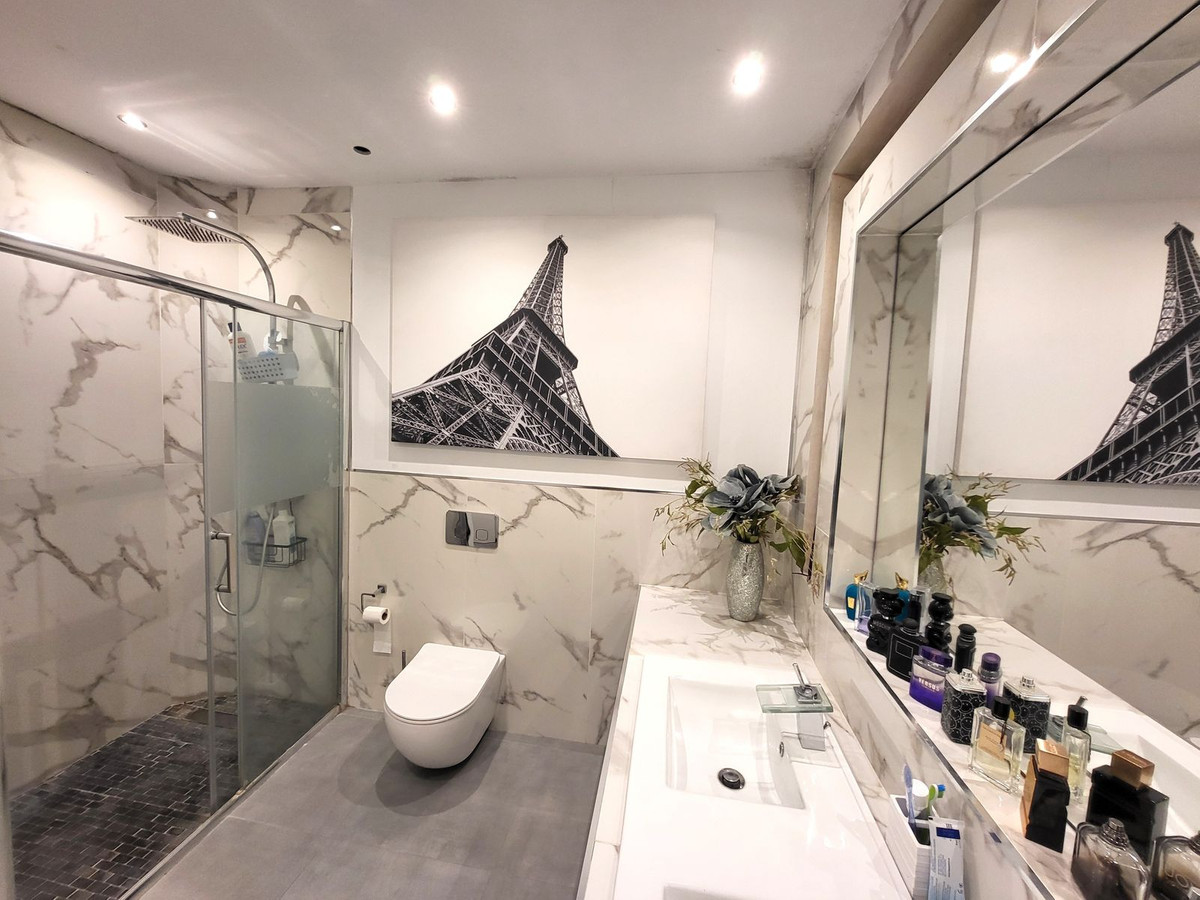 On the main floor, you will find the main entrance leading to a bright living room with an open-plan kitchen, a guest toilet, and a laundry area. From the living room terrace, you can enjoy stunning views.