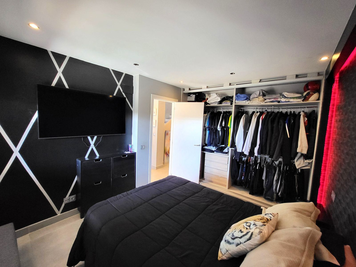 The first floor, or private suite area, features the master bedroom with a private terrace offering beautiful sea views, a stylish full bathroom, and an additional room currently used as a walk-in closet and office.
