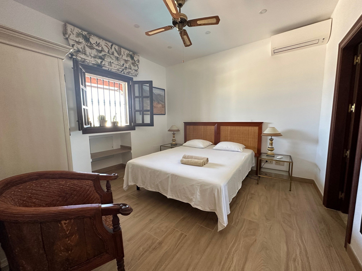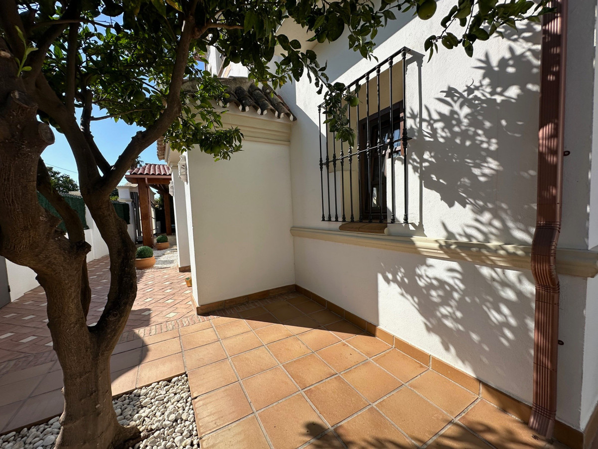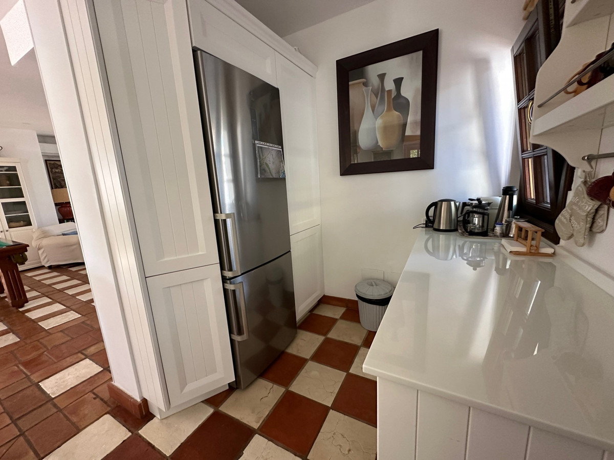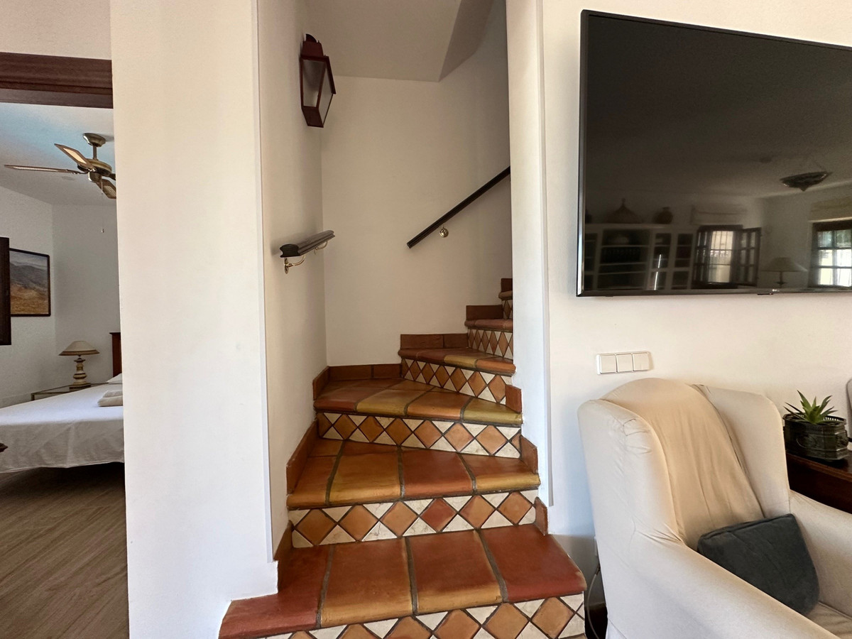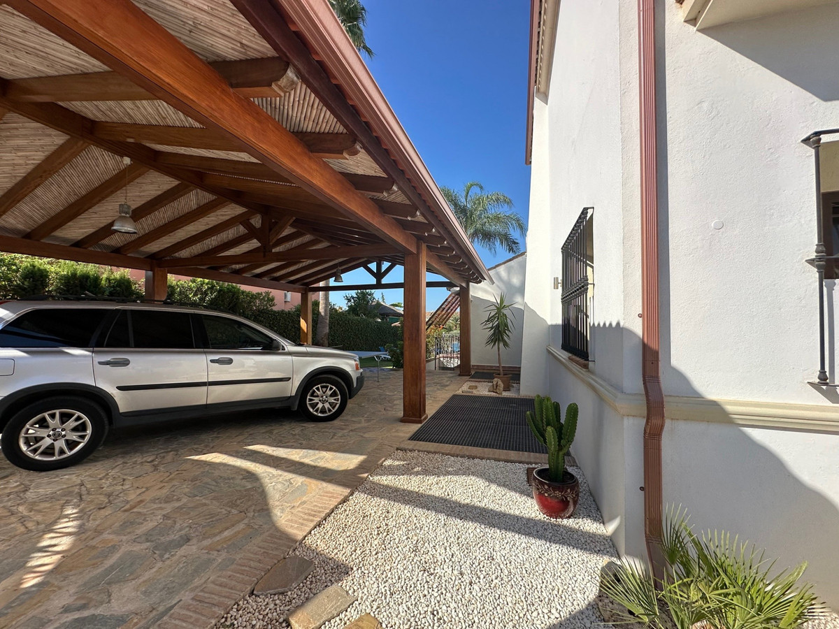 Beautiful rustic, solidly built house on the sea side of San Pedro de Alcantara. The house consists of an entrance area with an open modern kitchen, living-dining room with exit to a raised terrace with a beautiful view of the greenery. In this entrance area there is a bedroom with bathroom, one suite. In the upper part there are 3 further bedrooms with 2 bathrooms. On the ground floor there are 2 further bedrooms and 1 bathroom. There is also another living room and a storage room. There are 2 carports, a heated swimming pool and a beautiful, well-kept garden around the house. Due to the west-facing location, the house is very bright and sunny. Ideal family home or for renting all year round. The beach or the center of San Pedro are only a few minutes' walk away.
