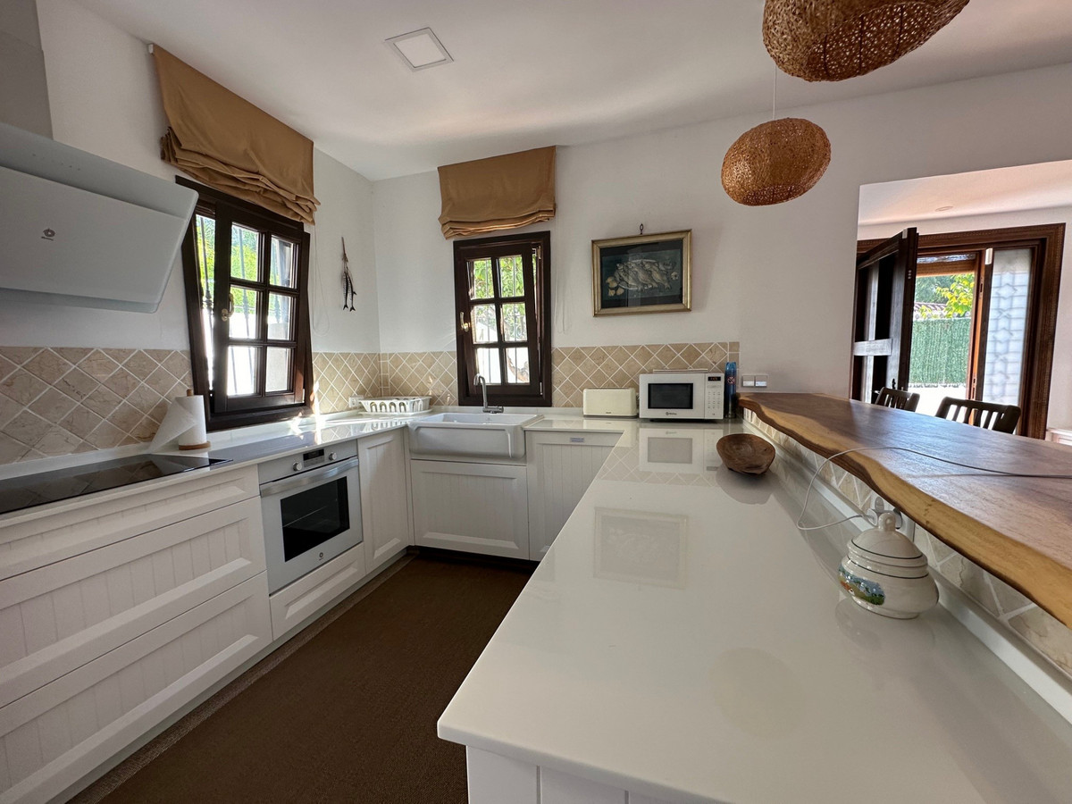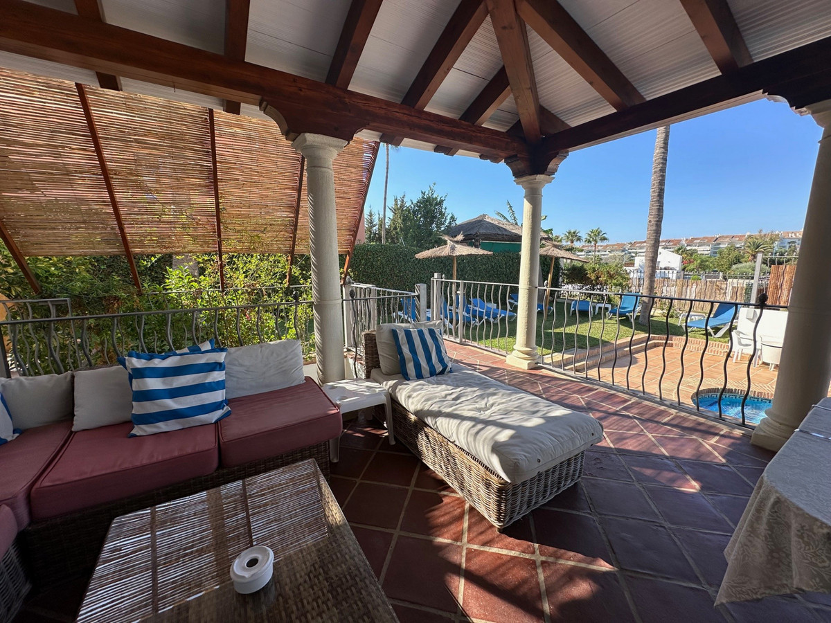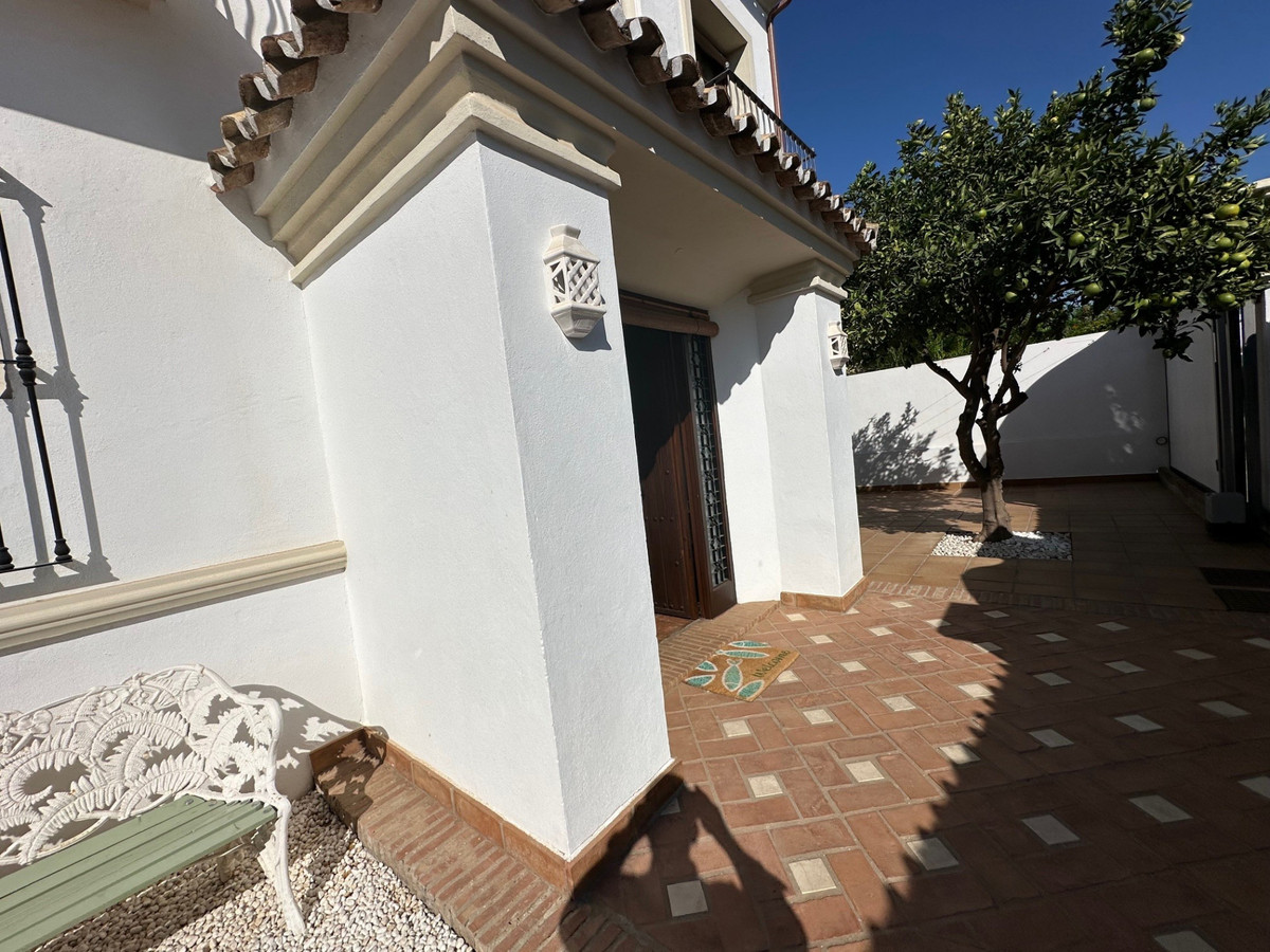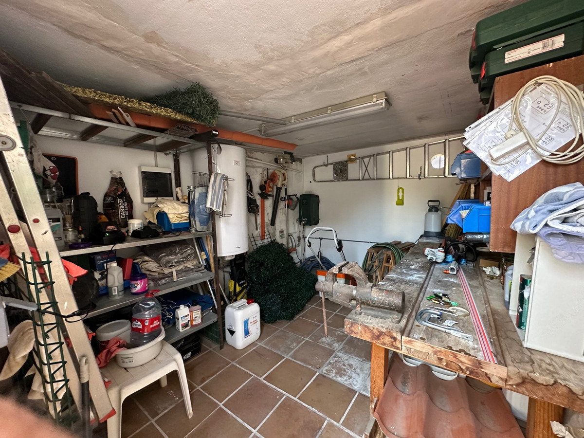 Beautiful rustic, solidly built house on the sea side of San Pedro de Alcantara. The house consists of an entrance area with an open modern kitchen, living-dining room with exit to a raised terrace with a beautiful view of the greenery. In this entrance area there is a bedroom with bathroom, one suite. In the upper part there are 3 further bedrooms with 2 bathrooms. On the ground floor there are 2 further bedrooms and 1 bathroom. There is also another living room and a storage room. There are 2 carports, a heated swimming pool and a beautiful, well-kept garden around the house. Due to the west-facing location, the house is very bright and sunny. Ideal family home or for renting all year round. The beach or the center of San Pedro are only a few minutes' walk away.