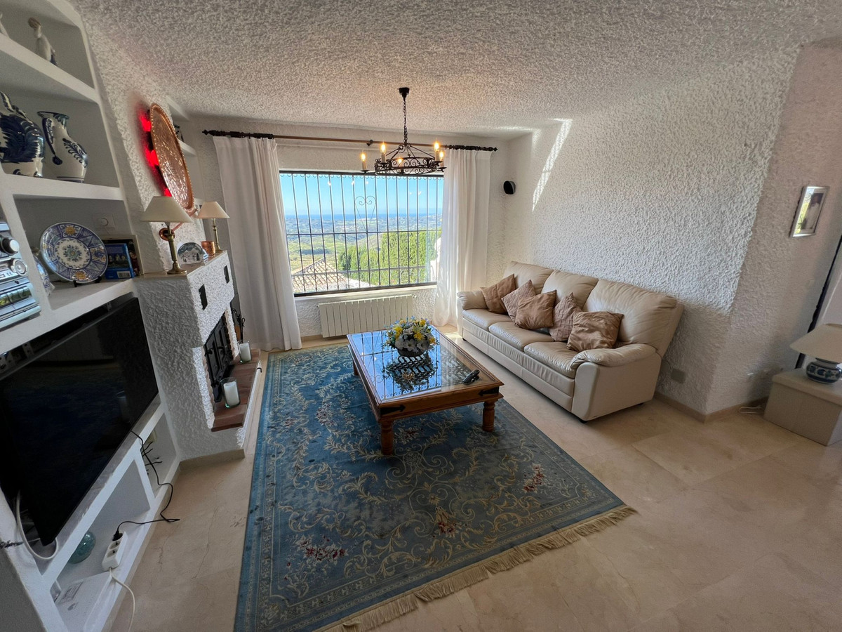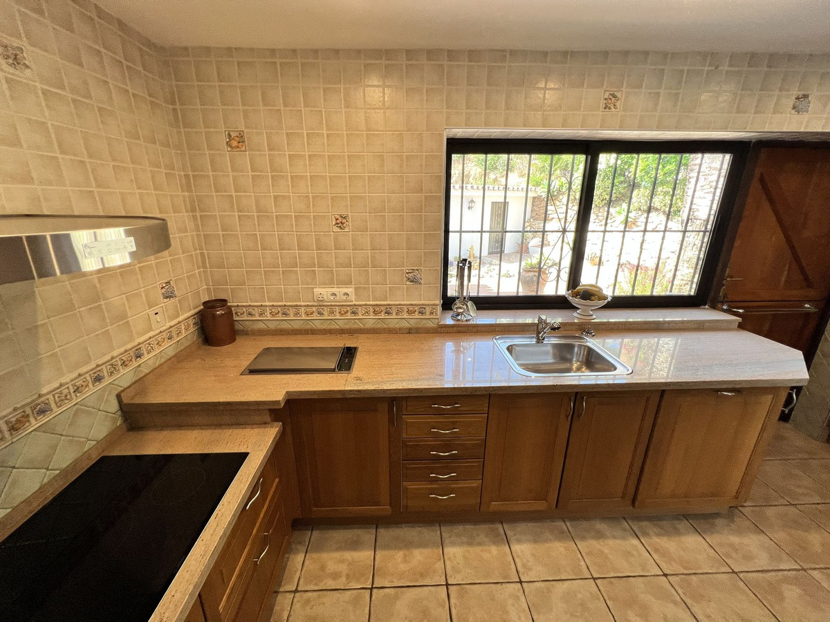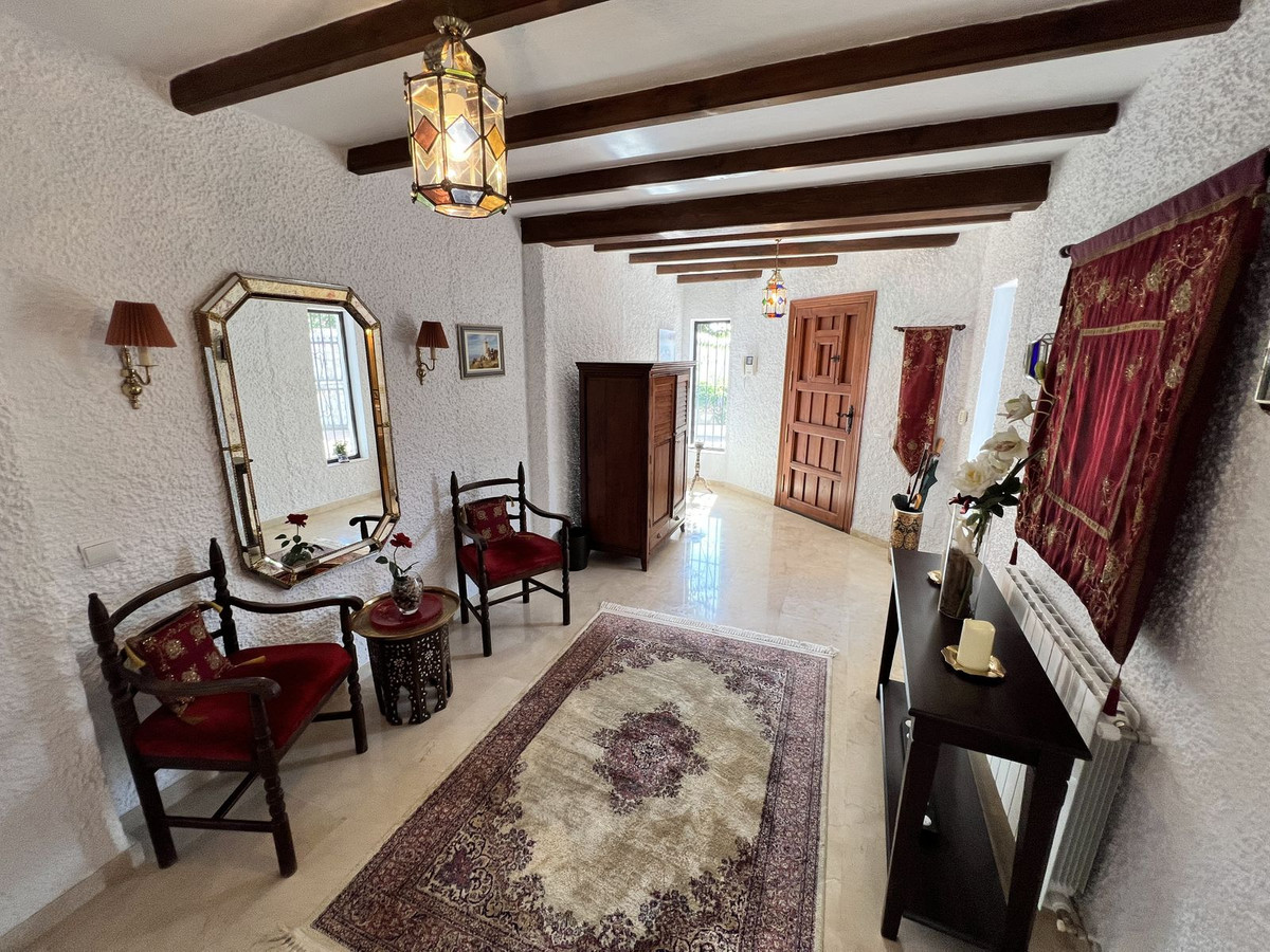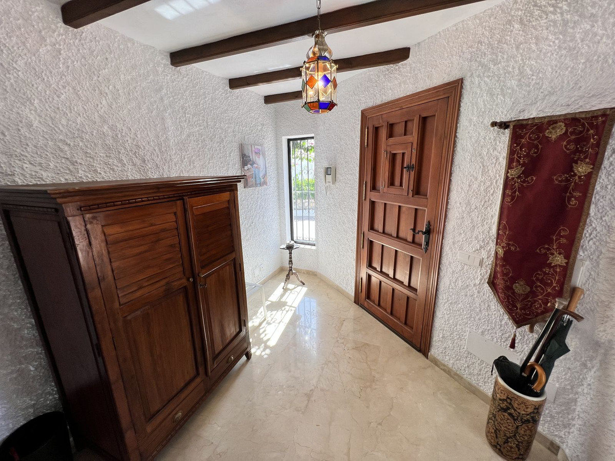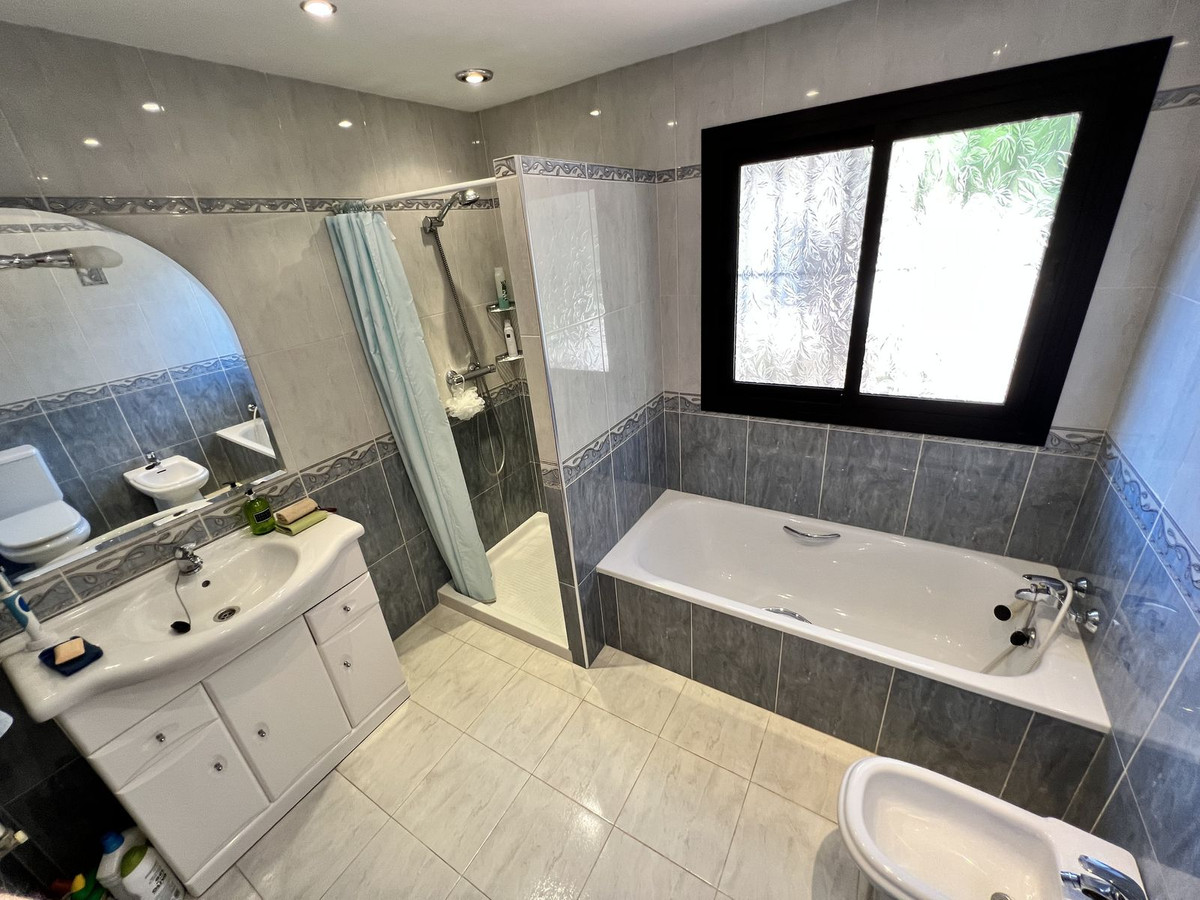To the back of the kitchen, via stable doors, is access to a delightful and spacious courtyard with a cactus garden, a large tiled wall mural, and additional storage and access to the garage. Returning to the villa, there is a Master bedroom with fitted bespoke furniture, a walk-in dressing room, and an en suite bathroom. There is also access to the terrace. Off the dining area is a lovely covered terrace with fabulous views including built-in seating with a marble-topped table and steps leading to the garden and pool. From this terrace is a lift with direct access to the level below.