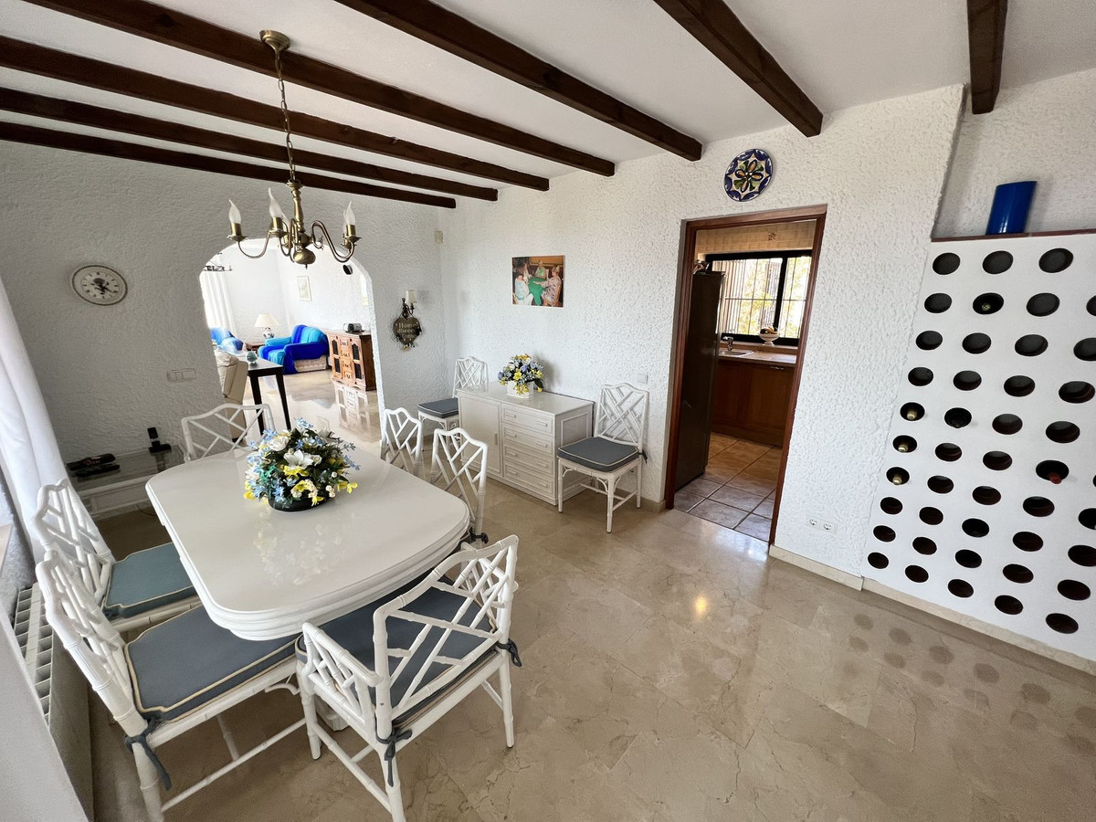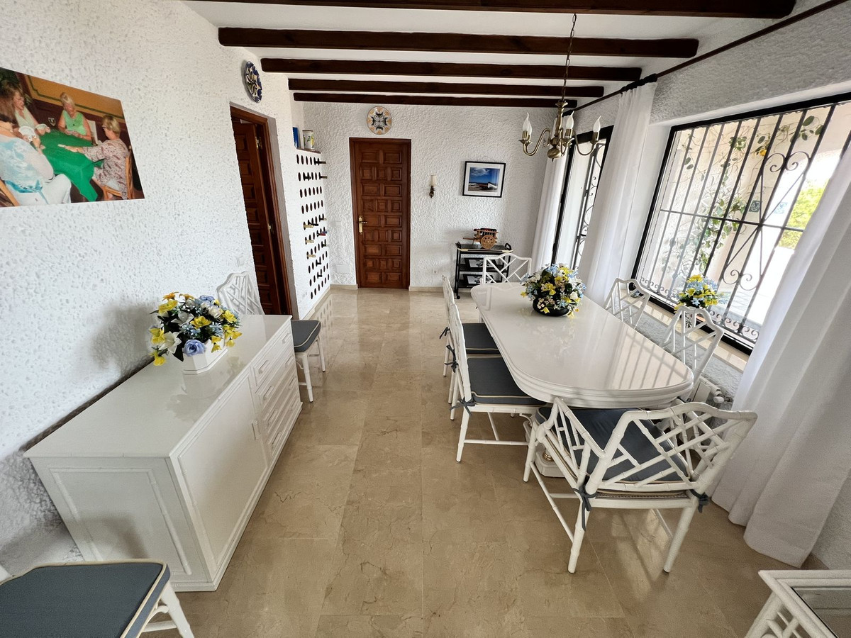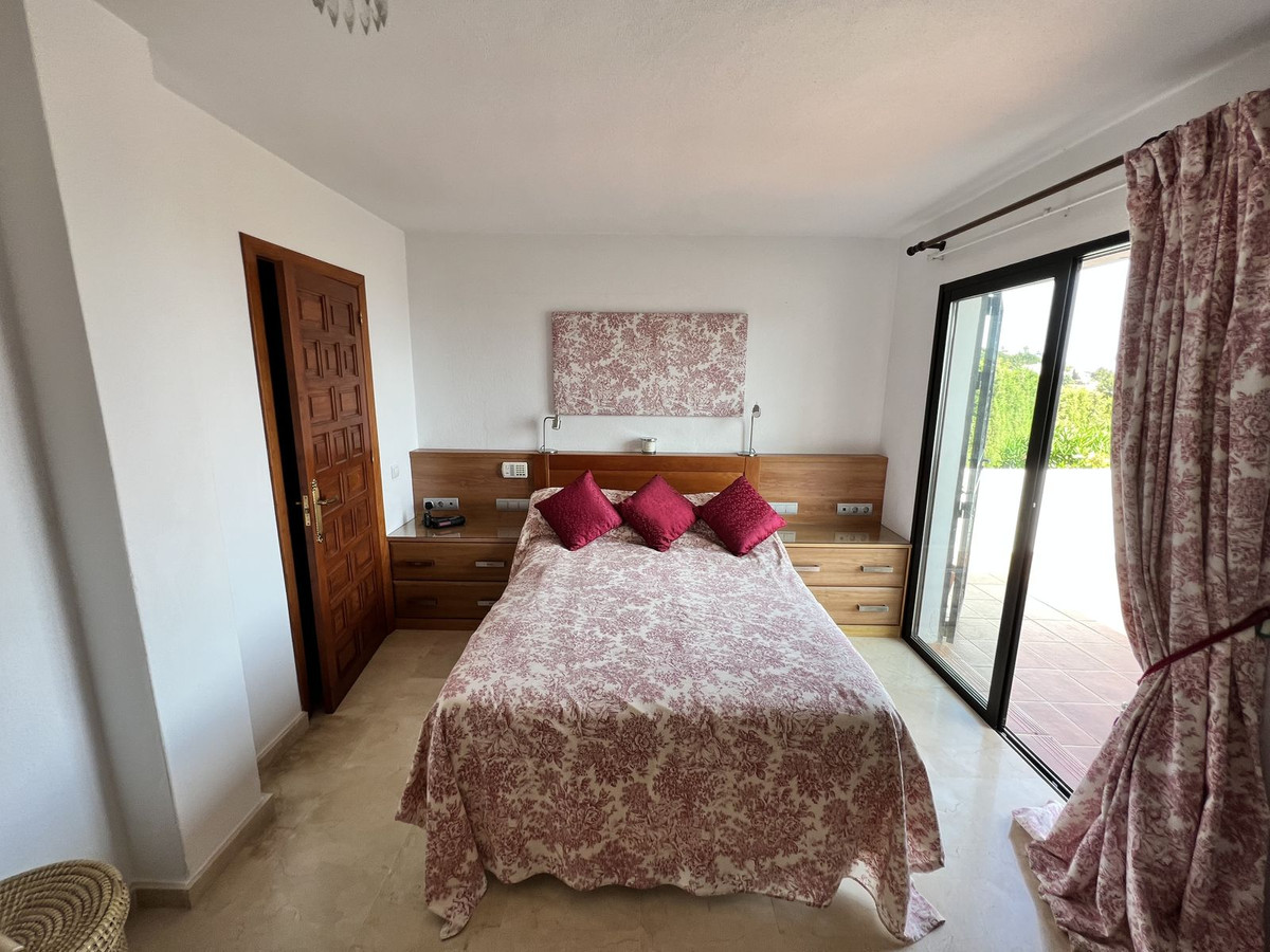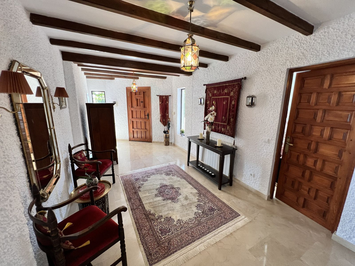 To the back of the kitchen, via stable doors, is access to a delightful and spacious courtyard with a cactus garden, a large tiled wall mural, and additional storage and access to the garage. Returning to the villa, there is a Master bedroom with fitted bespoke furniture, a walk-in dressing room, and an en suite bathroom. There is also access to the terrace. Off the dining area is a lovely covered terrace with fabulous views including built-in seating with a marble-topped table and steps leading to the garden and pool. From this terrace is a lift with direct access to the level below.