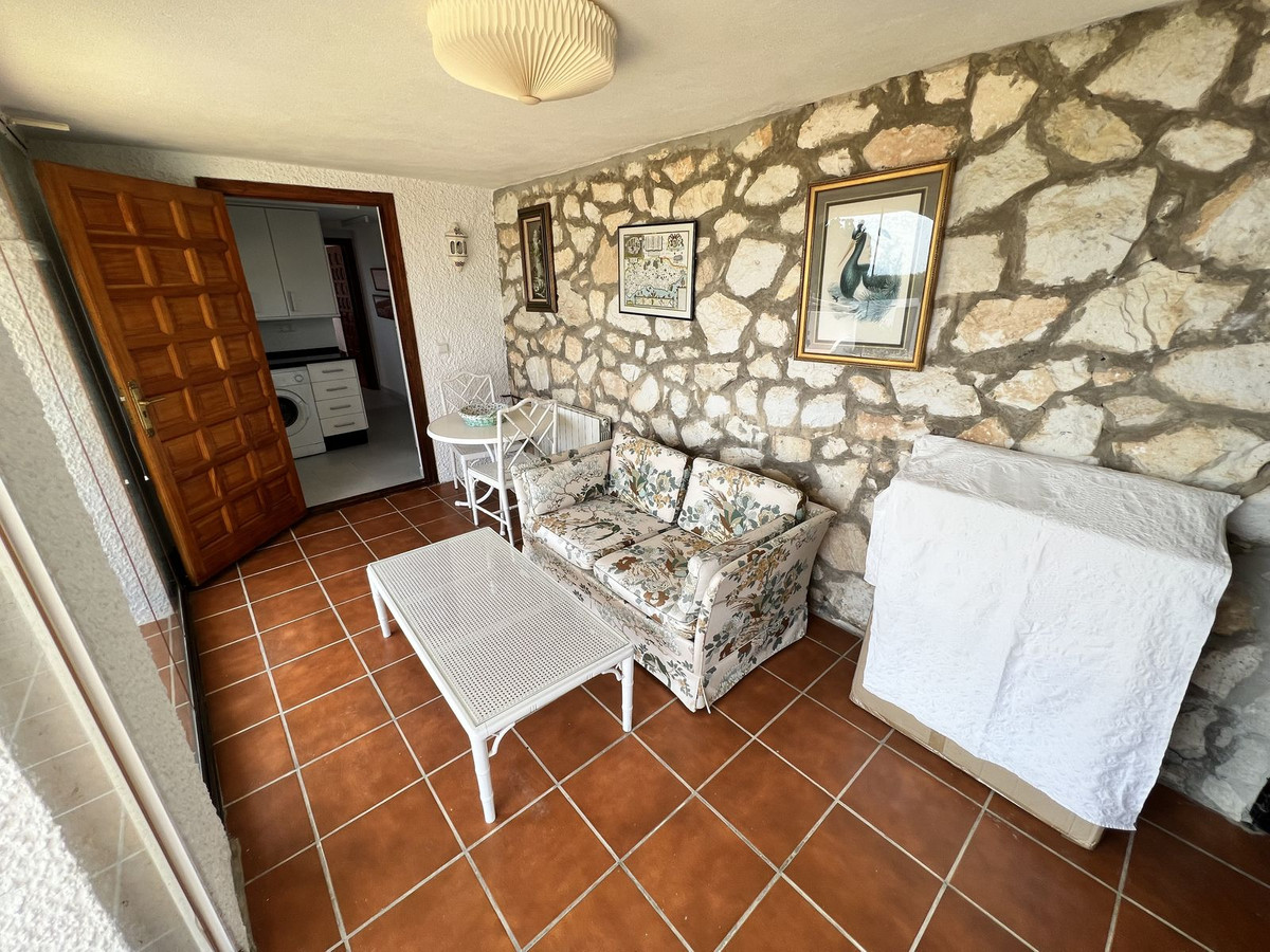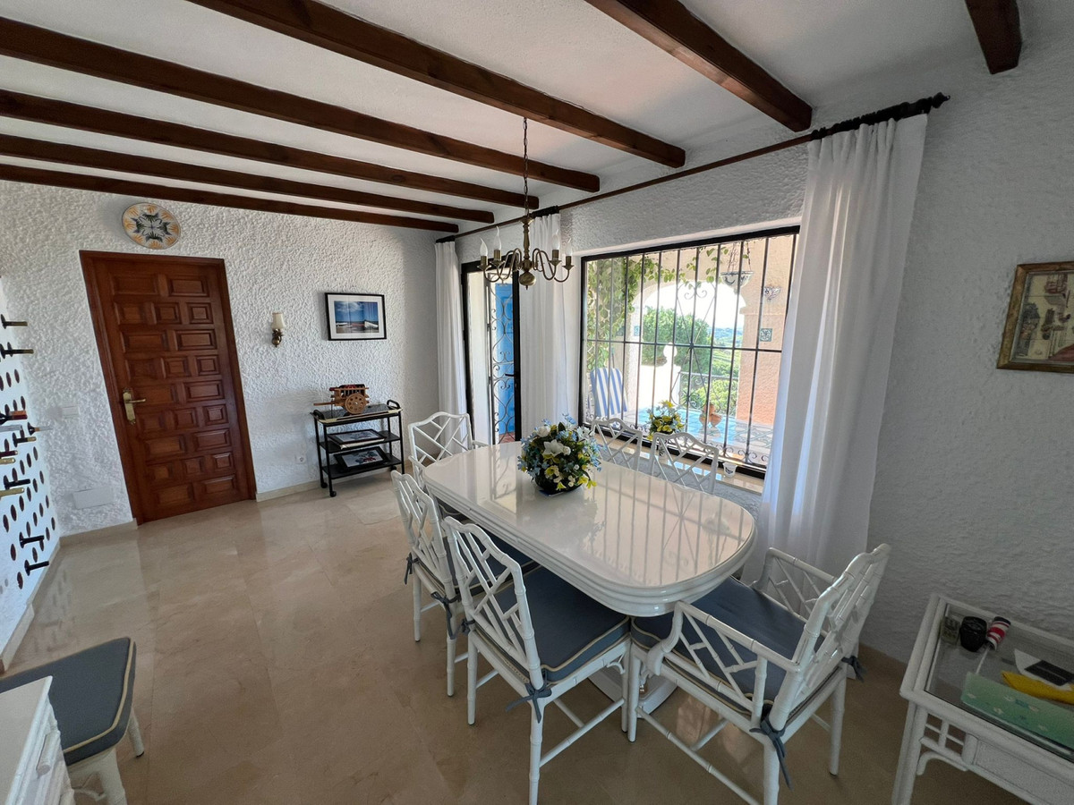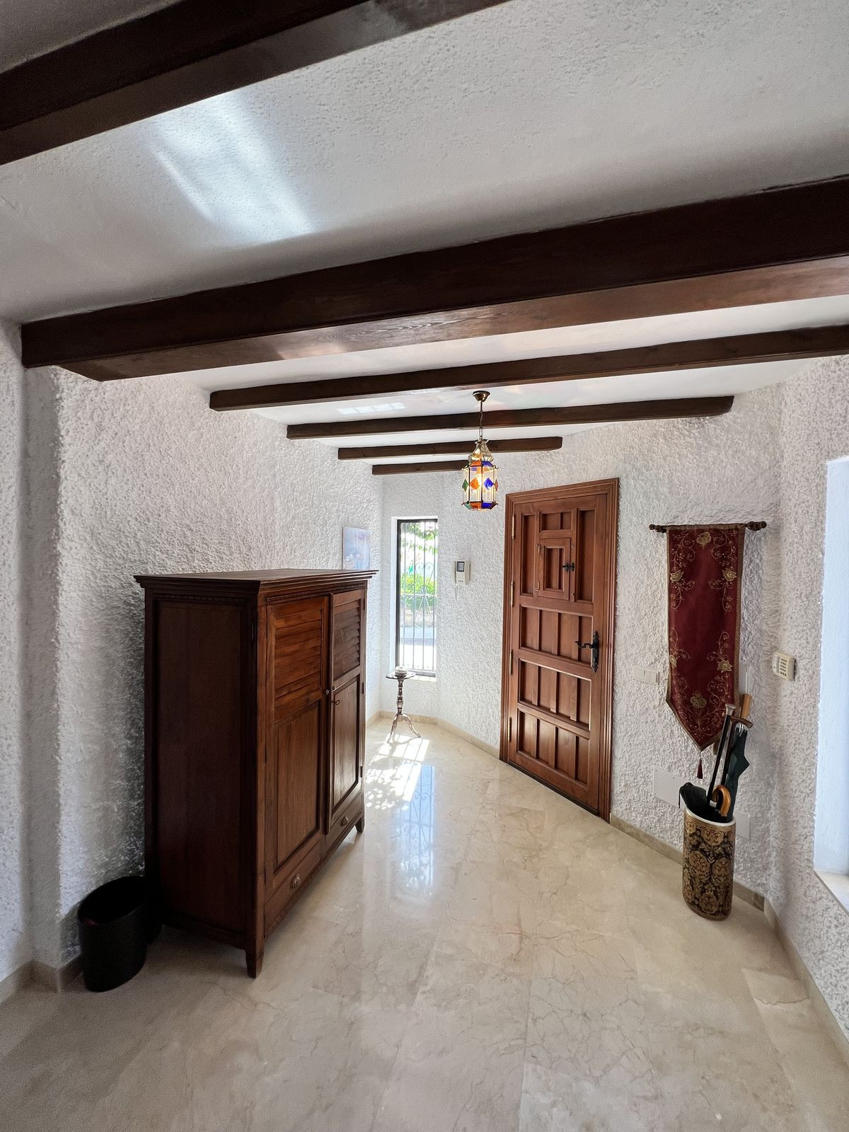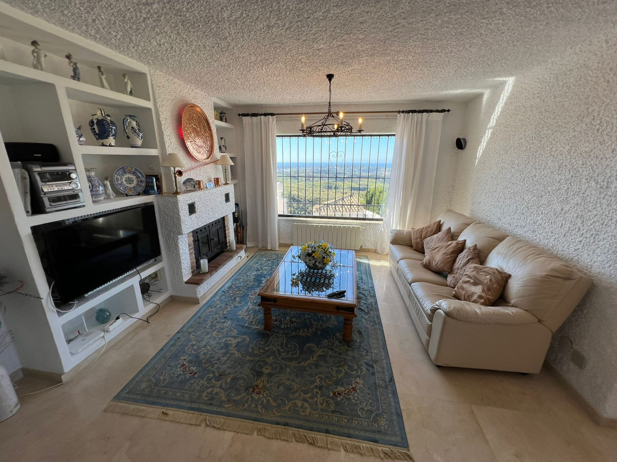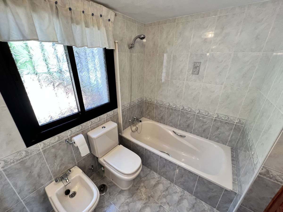 To the back of the kitchen, via stable doors, is access to a delightful and spacious courtyard with a cactus garden, a large tiled wall mural, and additional storage and access to the garage. Returning to the villa, there is a Master bedroom with fitted bespoke furniture, a walk-in dressing room, and an en suite bathroom. There is also access to the terrace. Off the dining area is a lovely covered terrace with fabulous views including built-in seating with a marble-topped table and steps leading to the garden and pool. From this terrace is a lift with direct access to the level below.