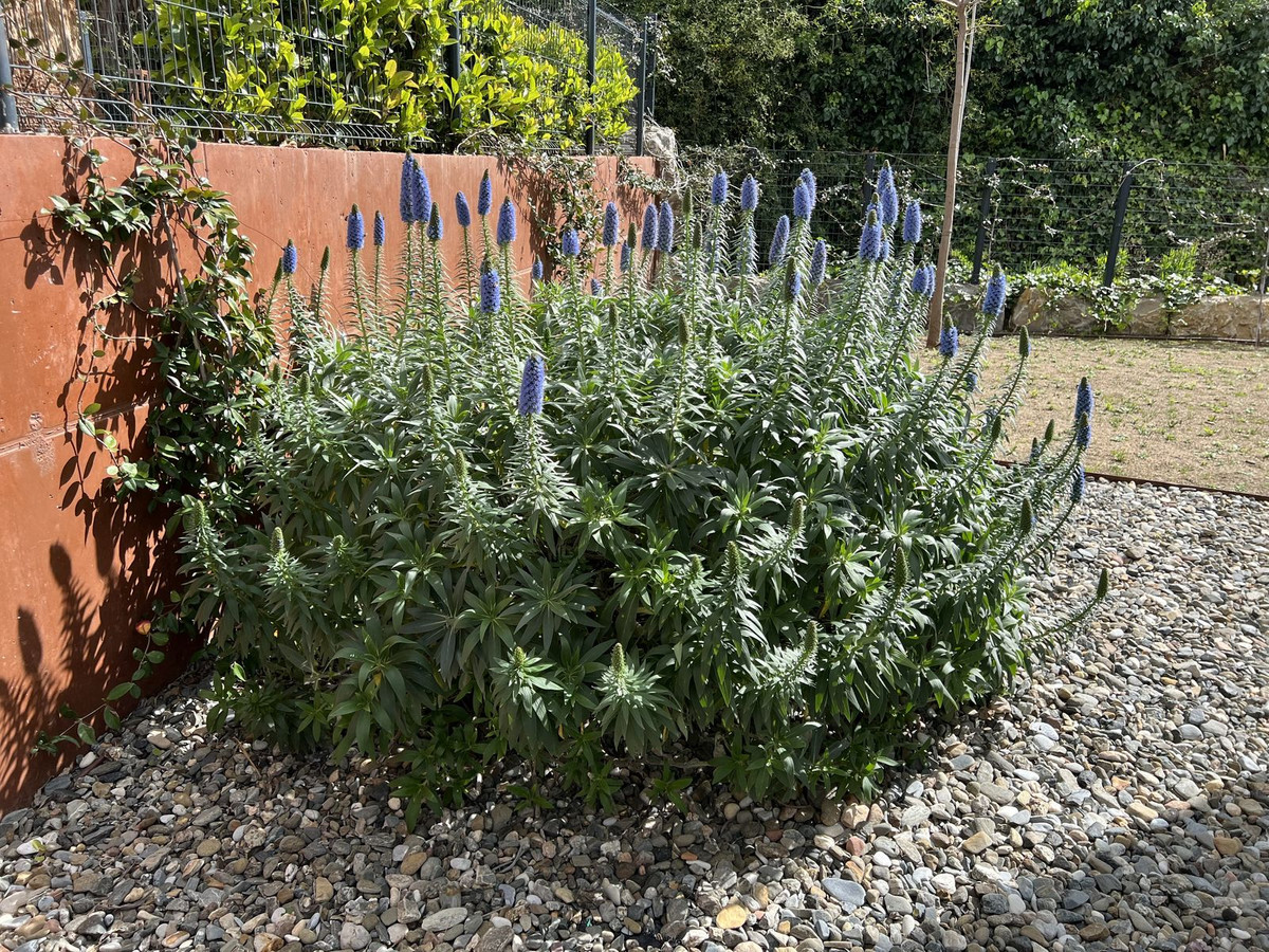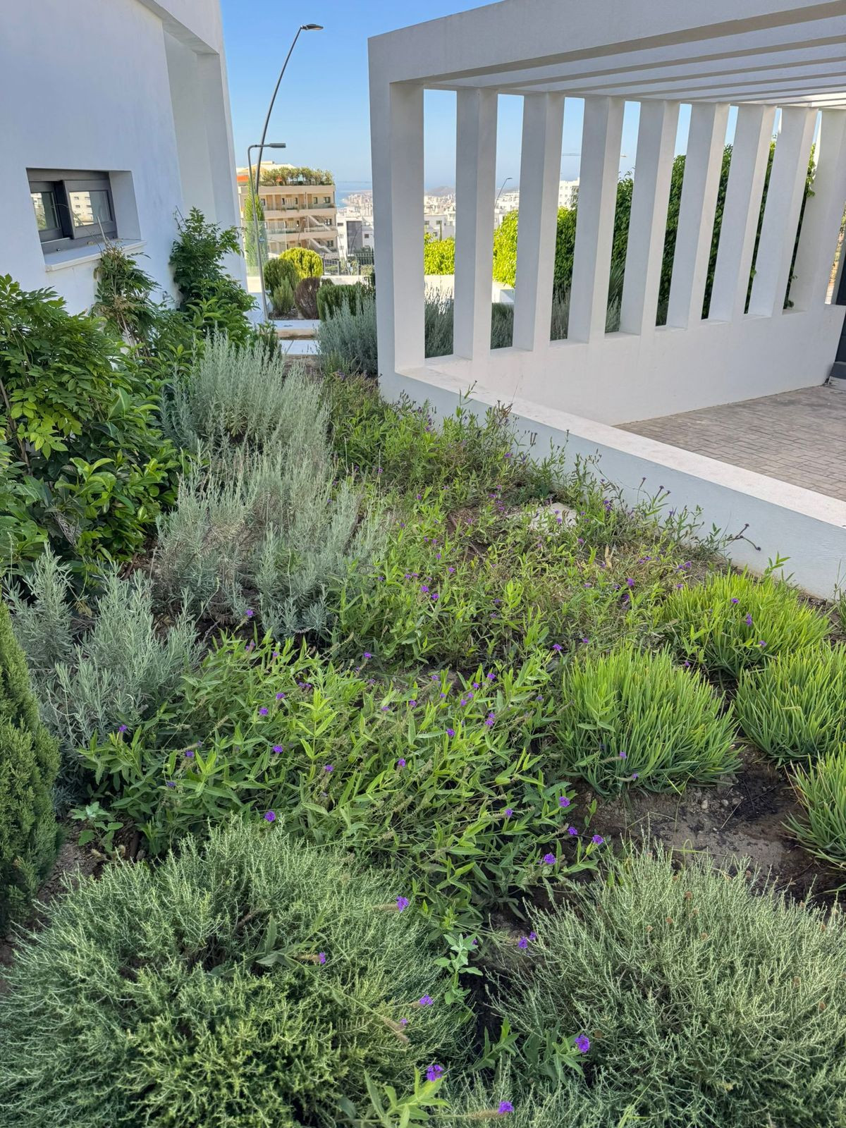 Landscaped garden with irrigation system, palm trees, olive tree, flowers and bushes