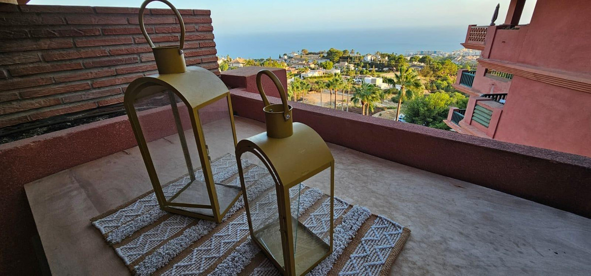 Beautiful furnished penthouse for sale in the Higuerón area, with three bedrooms and two bathrooms, one of them en suite. American-style kitchen furnished and equipped. Beautiful views towards the mountains at the back and beautiful views of the gardens, pool and sea at the front, living room and master bedroom. From the living room you can access a 20-meter terrace where you can enjoy beautiful sunrises with clear views. It has a centralized hot/cold air conditioning system. Alarm.
