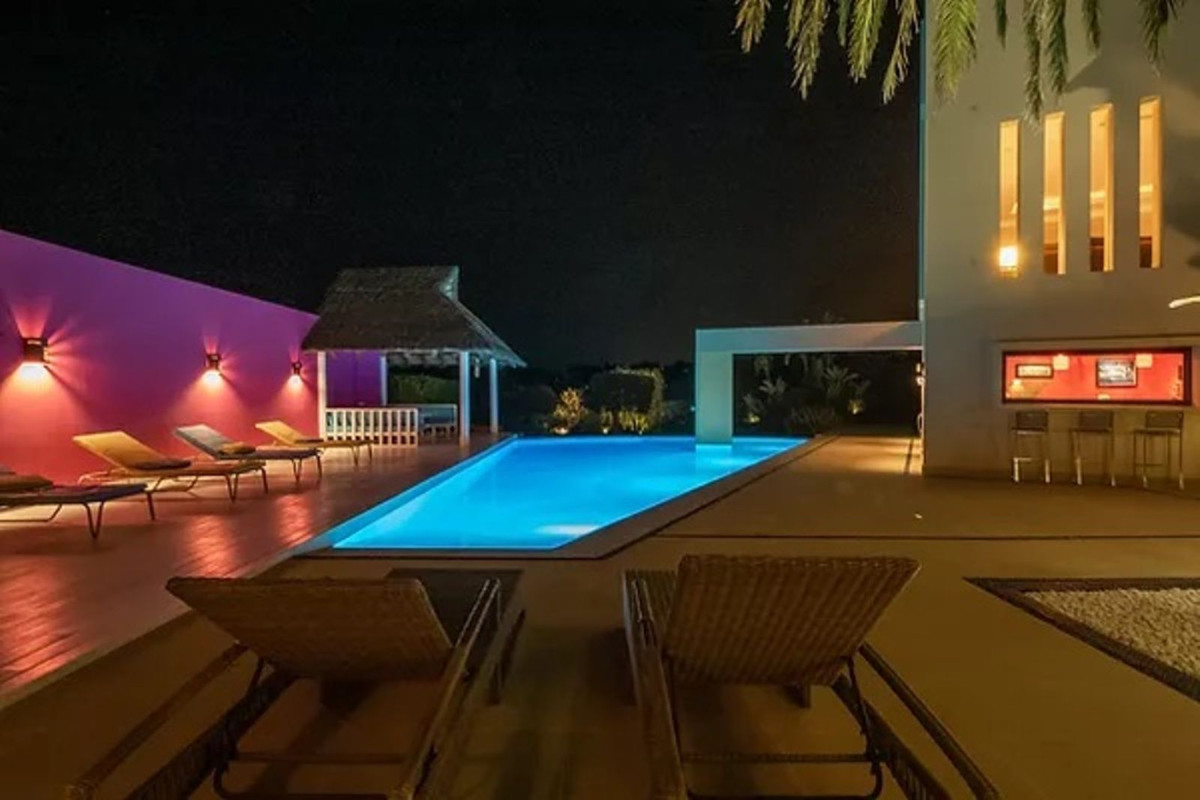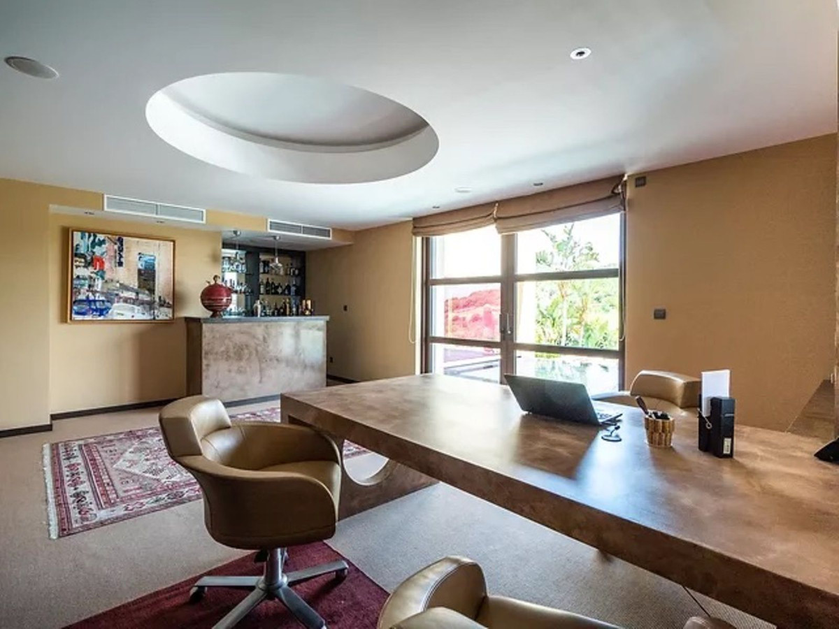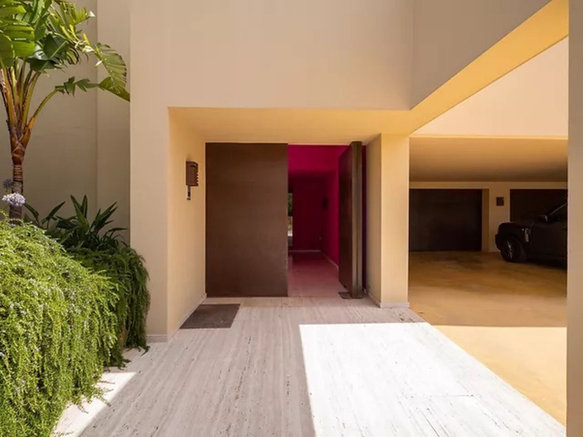 The main rooms, decorated with the nicest Georgetti furniture and kitchen all have access to the outdoor with certain areas having the Barragan-specific strong colours. Bright walls accentuate the space on the terraces near the Koi pond and the sun protected outside BBQ area, which connects to a split level garden with fountain and strong color wall surrounding, protected to wind and offering total privacy. The infinity swimming pool with stunning Siccis mosaic, IPE wooden terrace and Mexican style hut. On sunny periods the outside blends with the inside, the lights and shadows play like an artist canvas. The most dramatic style part of this mansion is the spacious outdoor living area with glass roof and electric sculpted lattice shutters which play with ever changing quality of light and shade from roof and front part separating the garden without taking away the sea view.