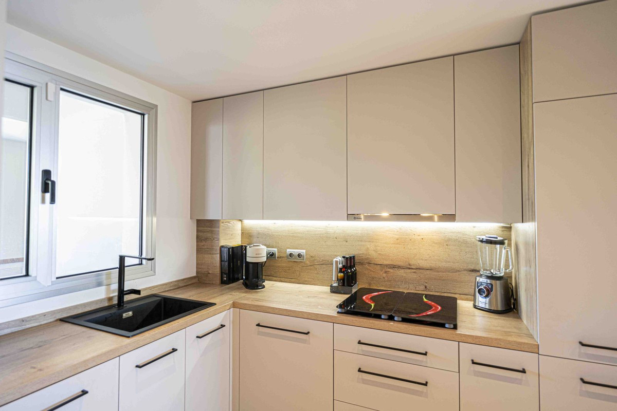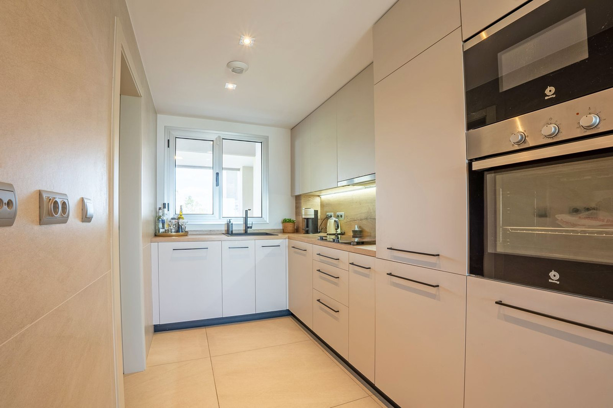 The fully fitted modern kitchen offers breathtaking mountain views and is complemented by a separate laundry/utility room. A standout feature of this property is its private garage, a rare and valuable addition that sets this apartment apart. For ultimate ease and convenience, an elevator takes you directly from the garage to your front door.